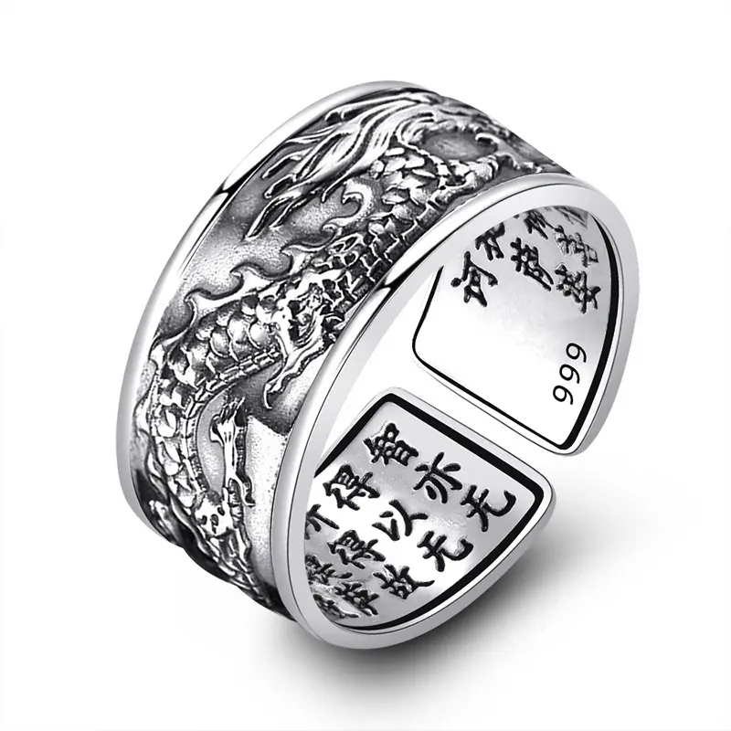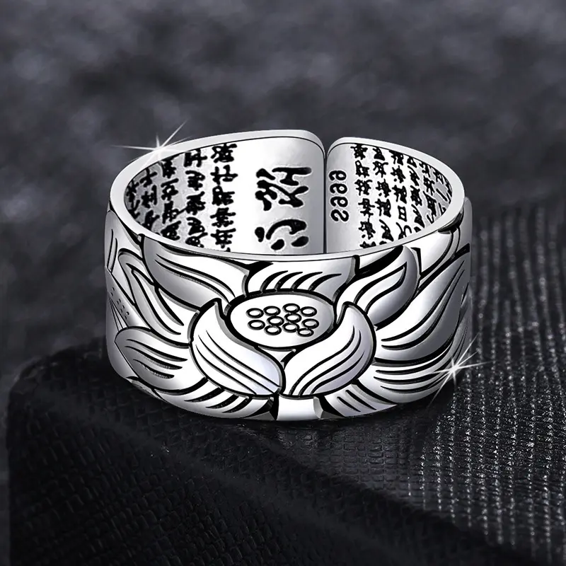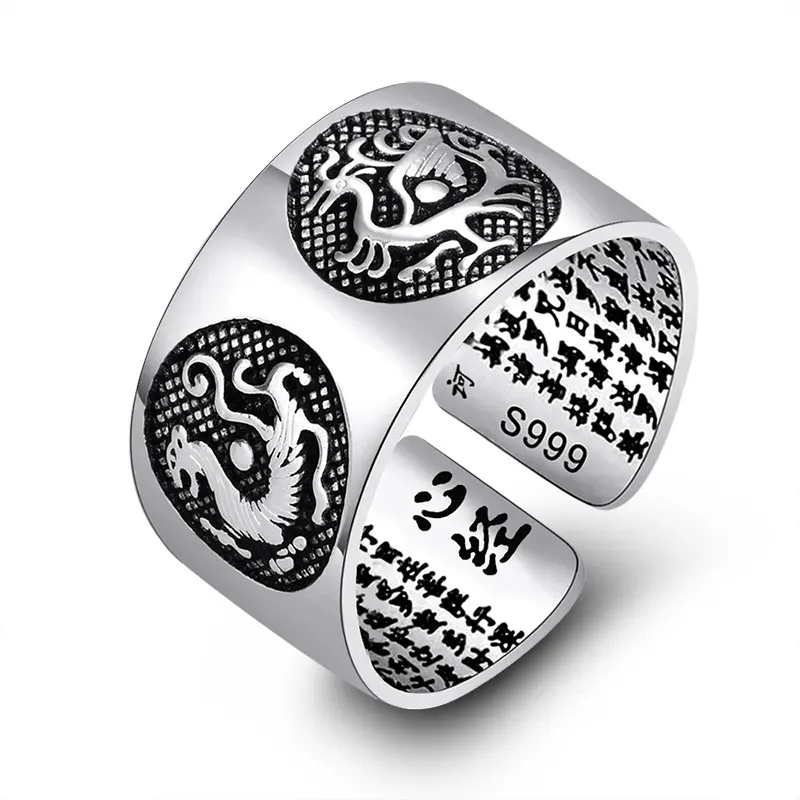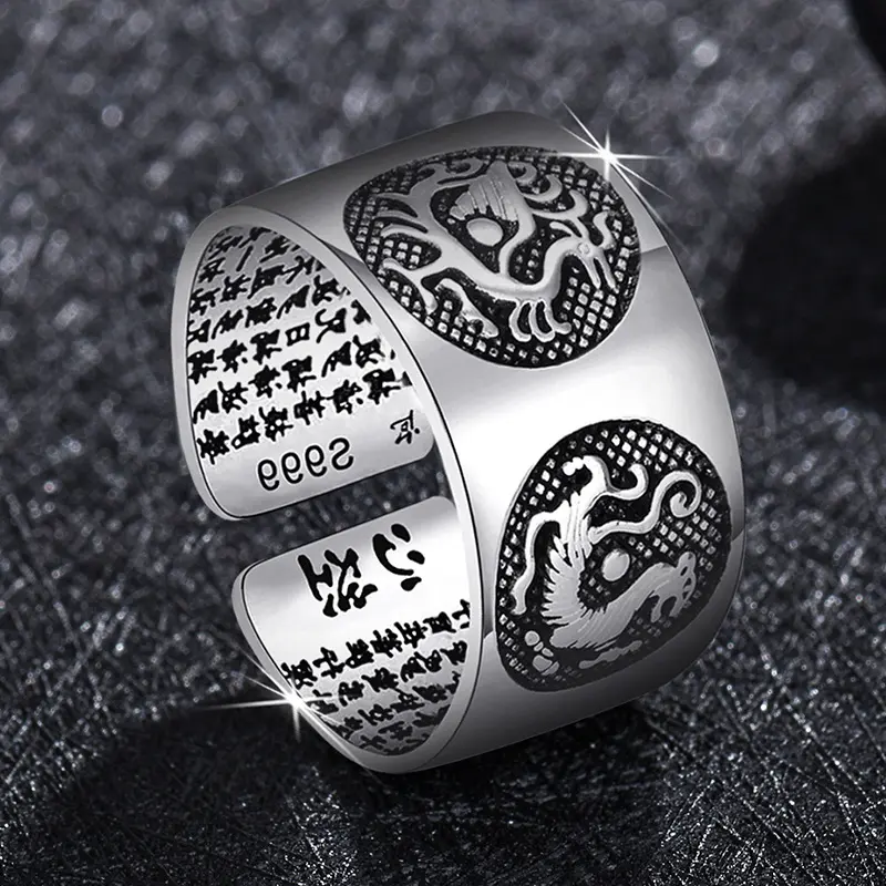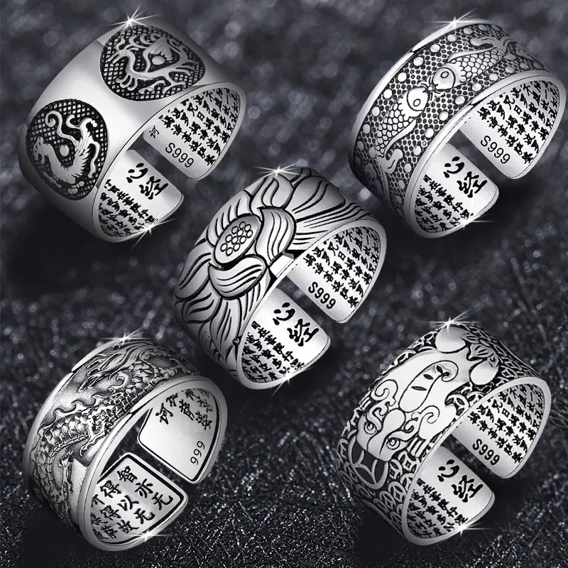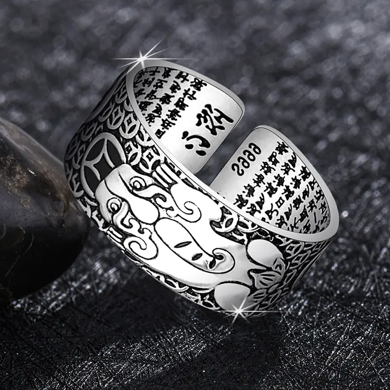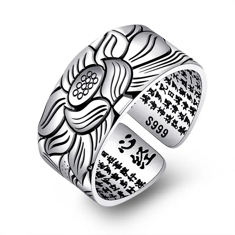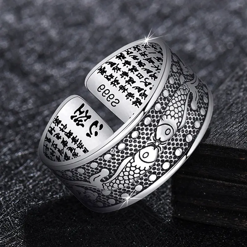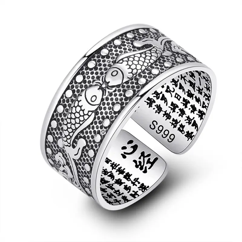 Thai Bank blackening lotus ring, retro Double Fish PI Xiu ring, powerful smooth wide surface men's and women's open ring