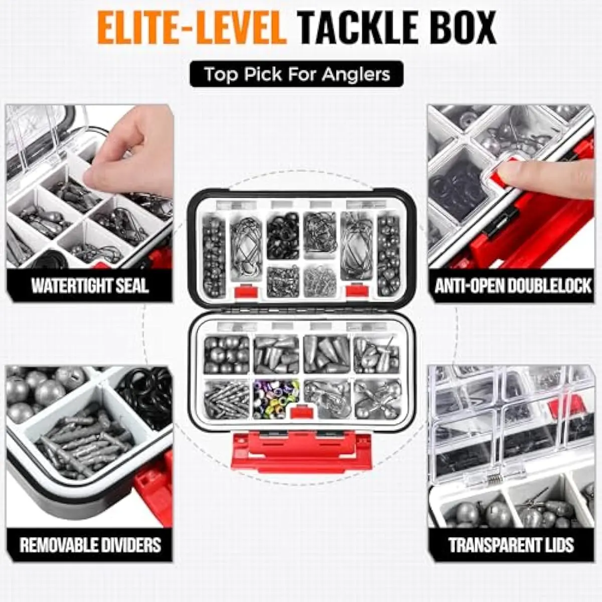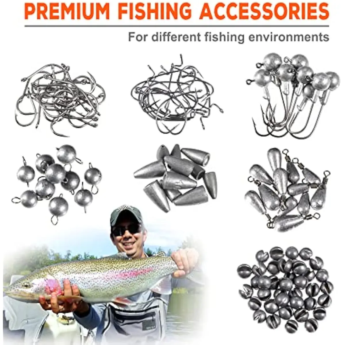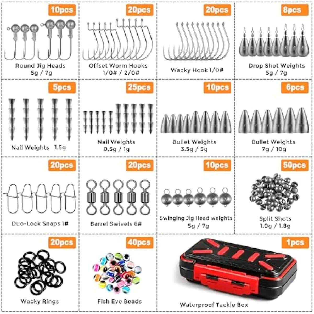 Various Fishing Tackle Set - 264pcs fishing accessories kit is loaded with 10 fishing rigs for fishing enthusiasts and beginners. It collects nearly all fishing stuff including Fishing Tackle Box, Fishing Hooks, Jig Heads, Drop Shot Weights, Nail Weights, Bullet Fishing Weights, Cannonballs Sinkers, Swivels and Snaps, Split Shots, Wacky Rings, Fish Eve Beads.