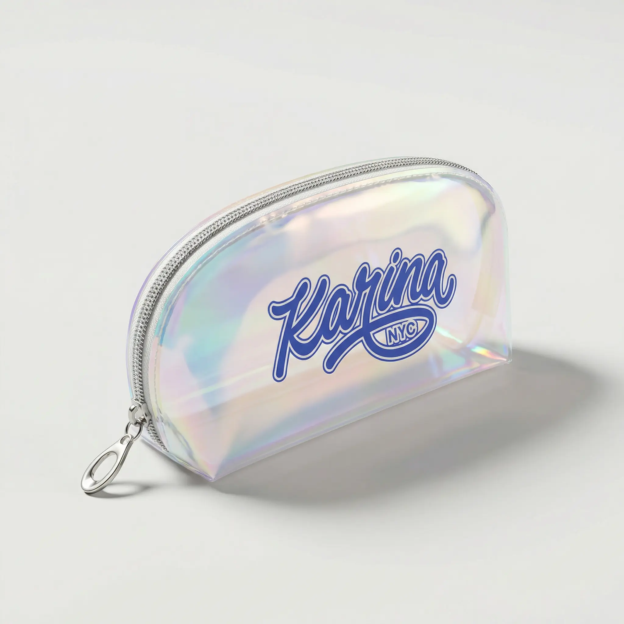 A compact zipper pouch designed to keep your small essentials organized in style. Finished in a glossy holographic material with Karina NYC logo detailing, this lightweight pouch is perfect for makeup, travel accessories, jewelry, tech items, or everyday must-haves. The silver-tone zipper and clip detail add a practical, polished finish, making it easy to toss into your tote or carry on the go.