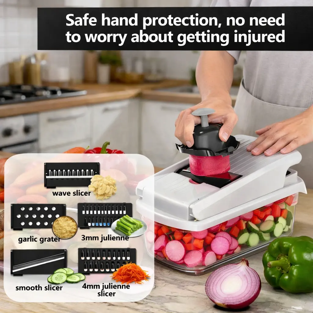 ✔ 15 interchangeable cutting functions in one tool ✔ Perfect, even cuts every single time ✔ No knife skills needed — safe and beginner friendly ✔ Built-in container catches everything — zero mess ✔ Compact, easy to clean, and easy to store