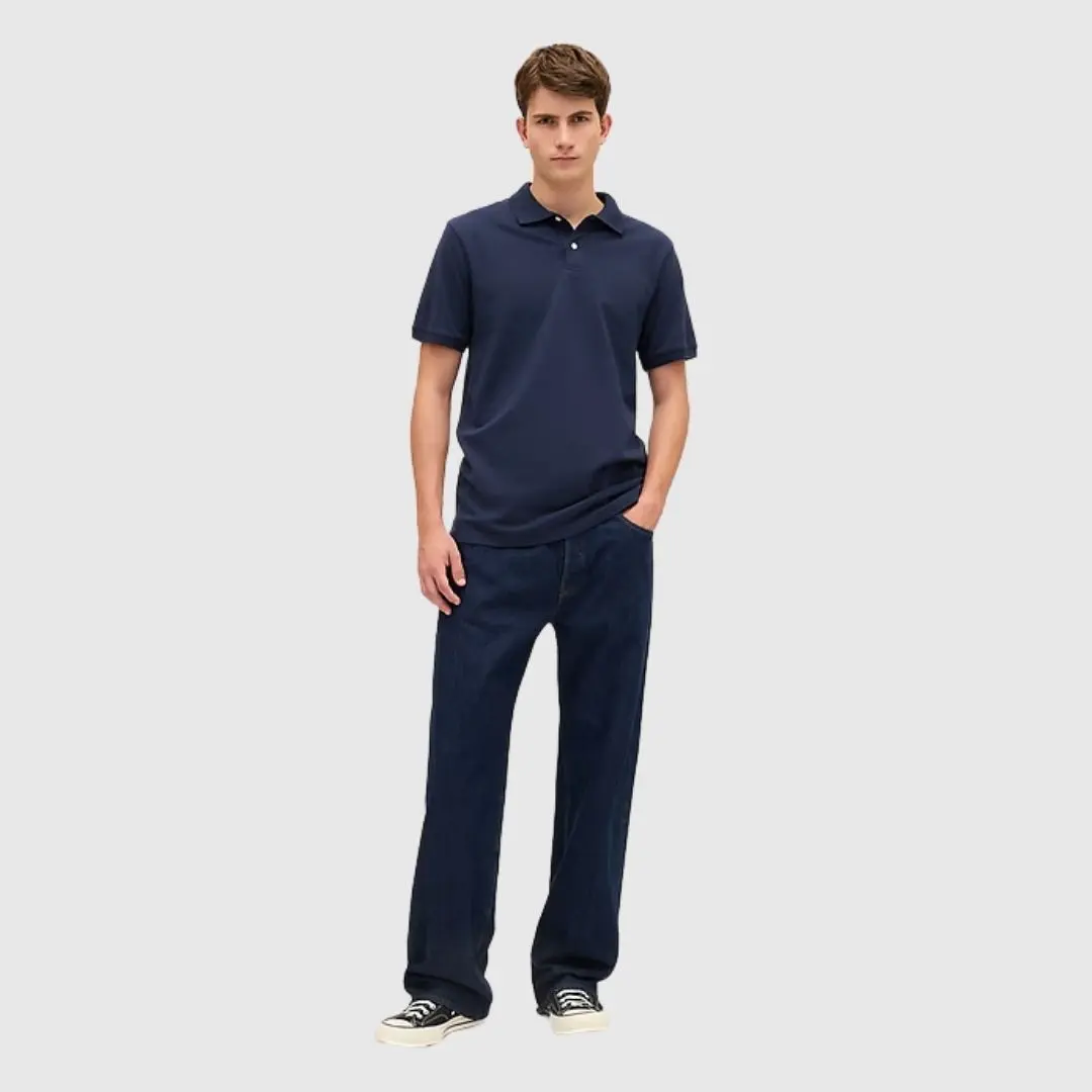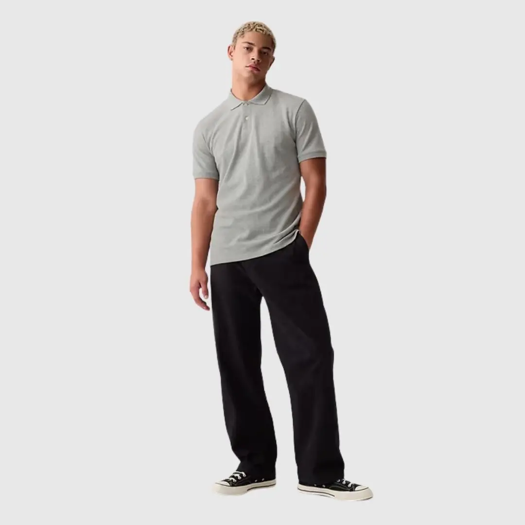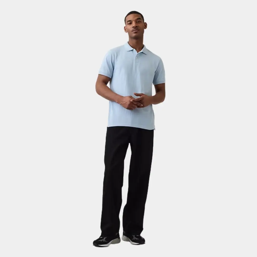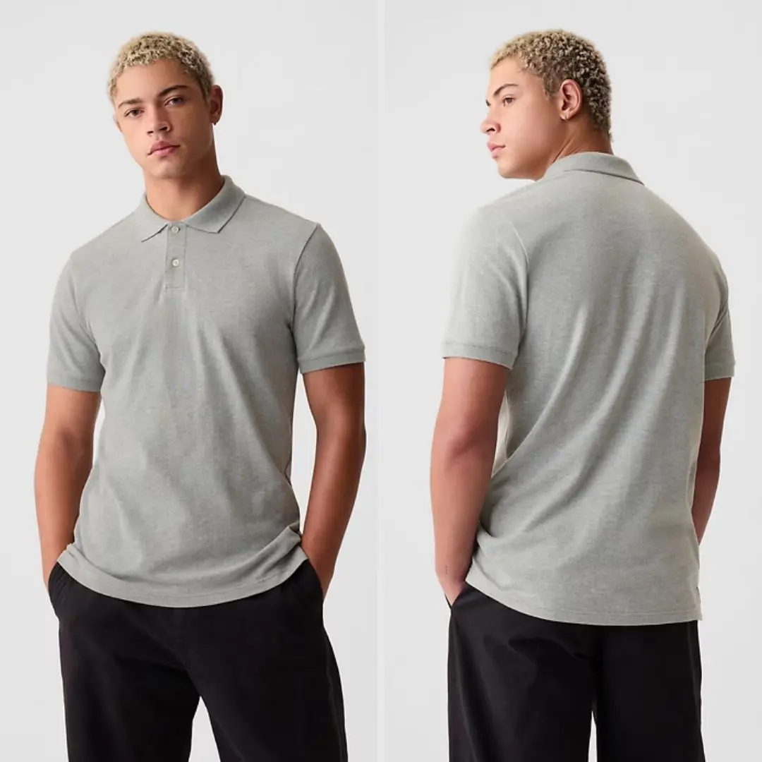 Soft, stretch pique knit ensures comfort with moisture-wicking properties. Perfect for everyday wear, this polo shirt features short sleeves with flat rib-knit cuffs. The flat rib-knit polo collar adds a classic touch. Button placket and side vents at the hem enhance functionality. Fit: Classic, straight & easy, hitting at the hip.