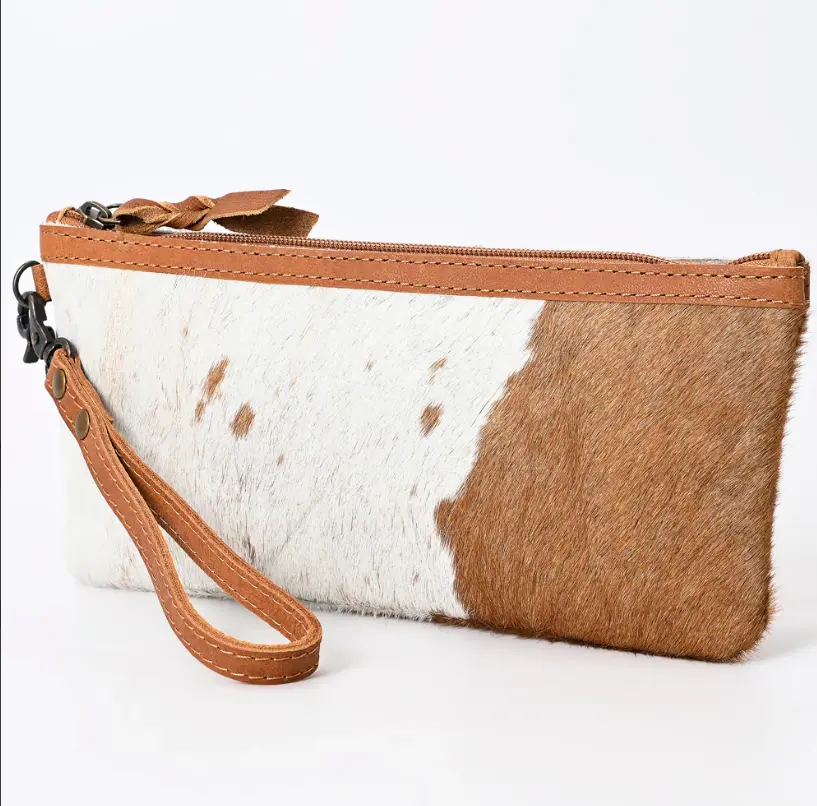 Indulge in the rugged sophistication of the American Darling Wristlet Bag, a masterclass in Western artisanal craft. This piece is meticulously constructed from High-Quality Soft And Supple Eco-Friendly Vegetable Tanned Full Grain Leather paired with authentic Hair-On Cowhide, offering a rich tactile experience and unmatched durability. The exterior showcases breathtaking natural textures and premium hide, designed for the woman who values high-end, handcrafted luxury in a compact form.