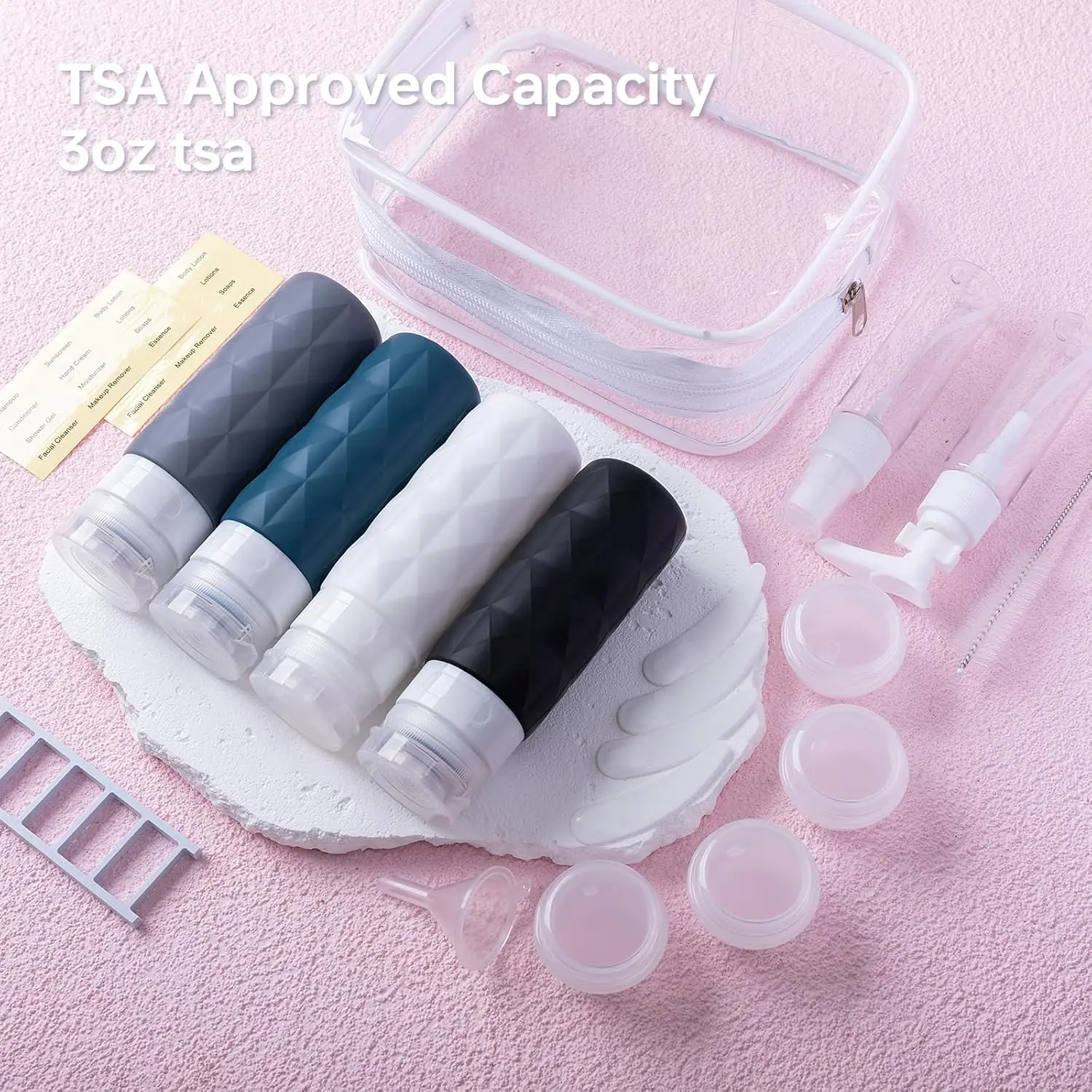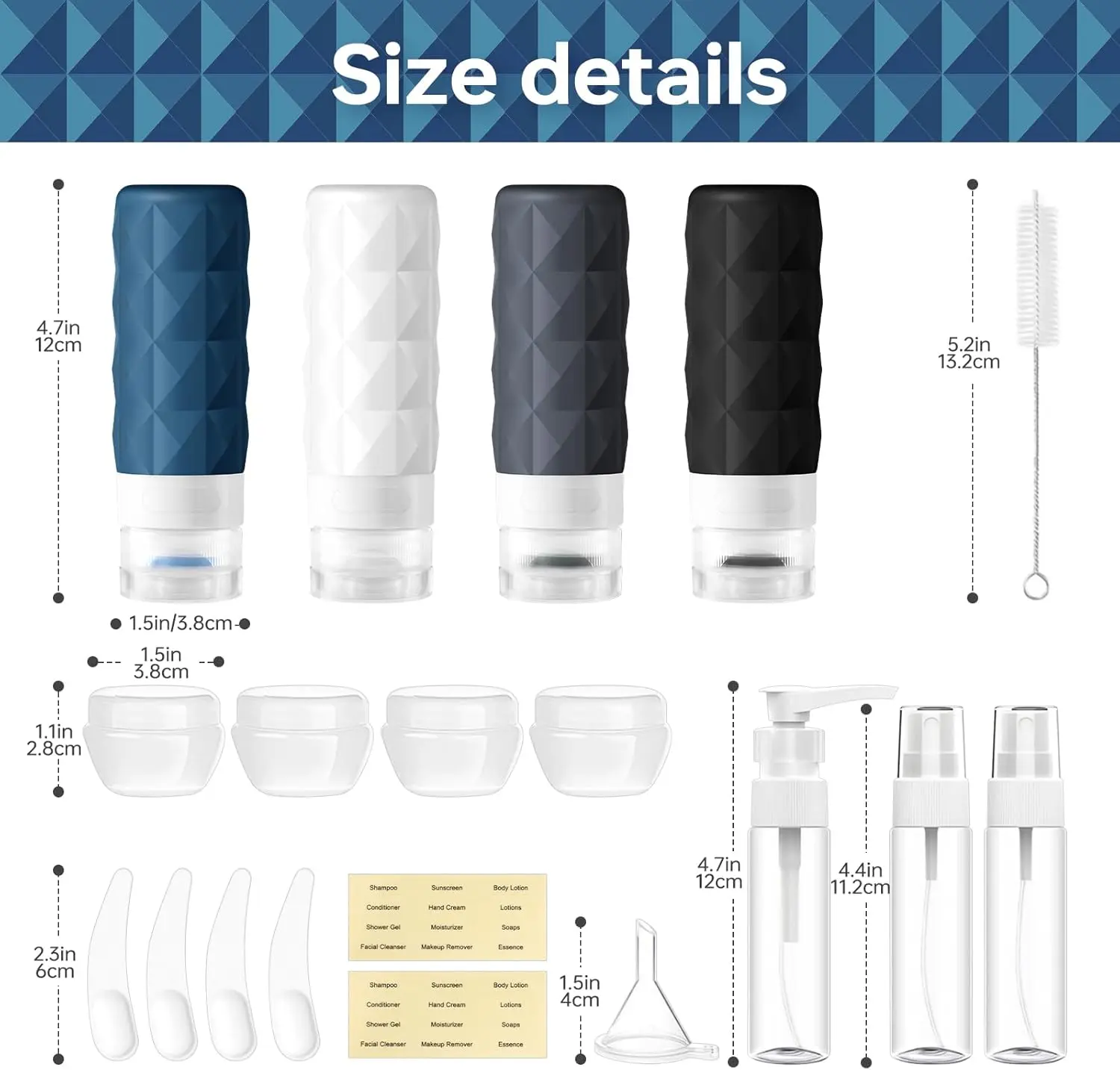 ·20Pack Useful Travel Accessories - 4 travel bottles (90ml/3oz), 4 cream jars (10ml/0.3oz), 2 spray bottle (30ml/1oz), 1 pump bottles (30ml/1oz),4 spoons, 1 funnel, 1 cleaning brush, 2 sticker label and 1 Tsa Approved Toiletry Bag. Suitable for travel,camping or other outdoor activities.