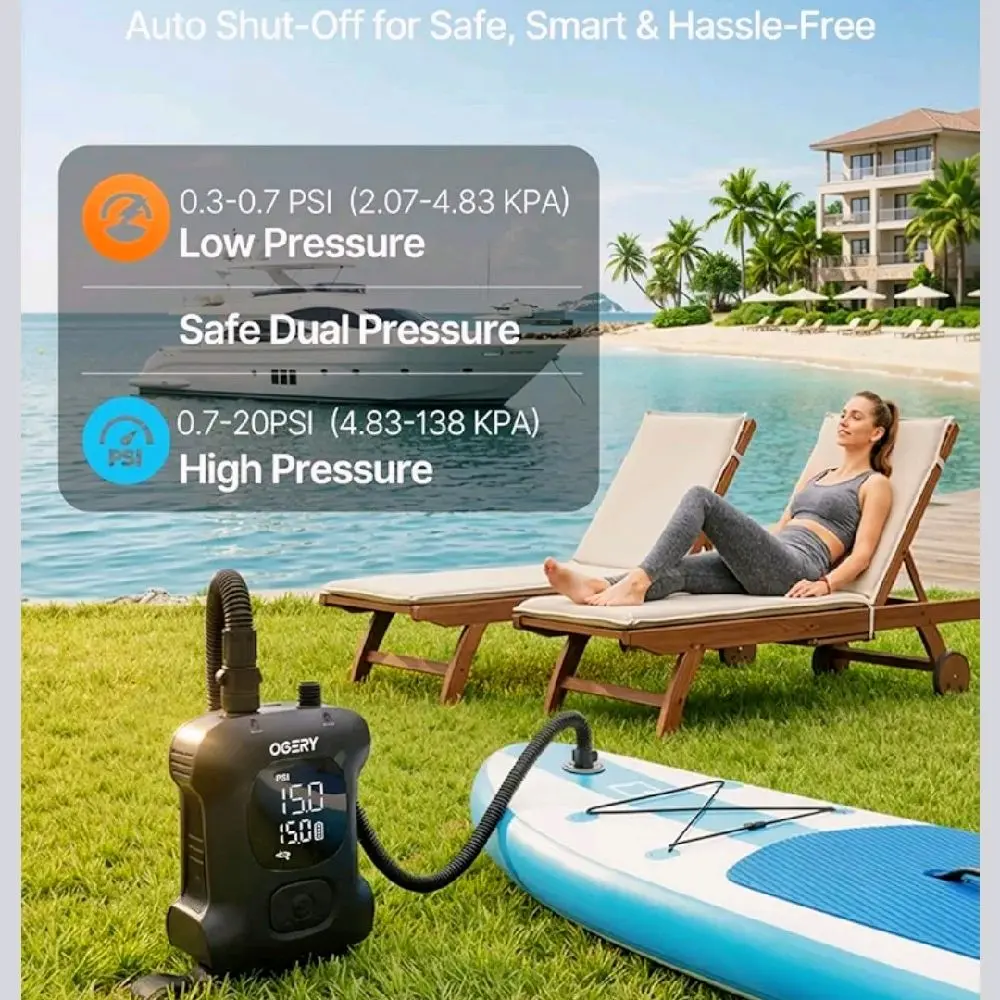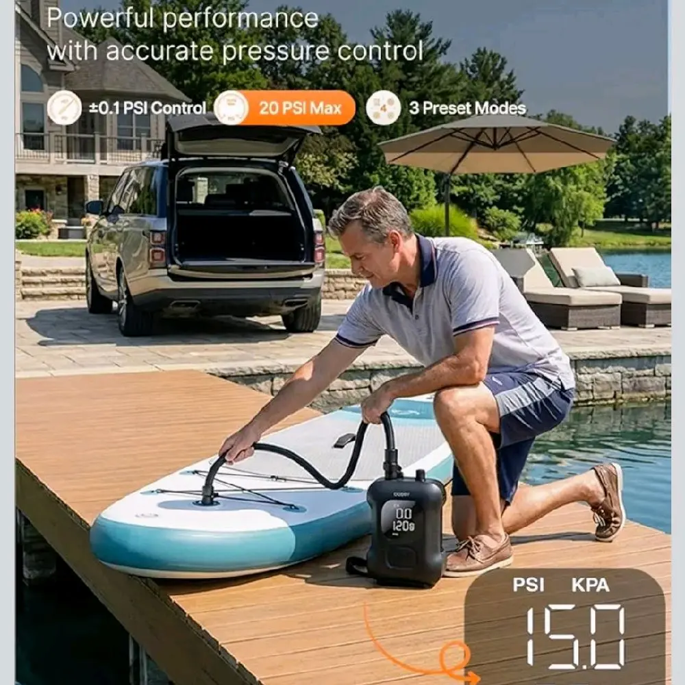 High-volume low-pressure filling switches to high-pressure mode. Inflates a standard SUP board to 12 PSI in about 7 minutes. Maintains stable airflow and efficiency. ⏱️