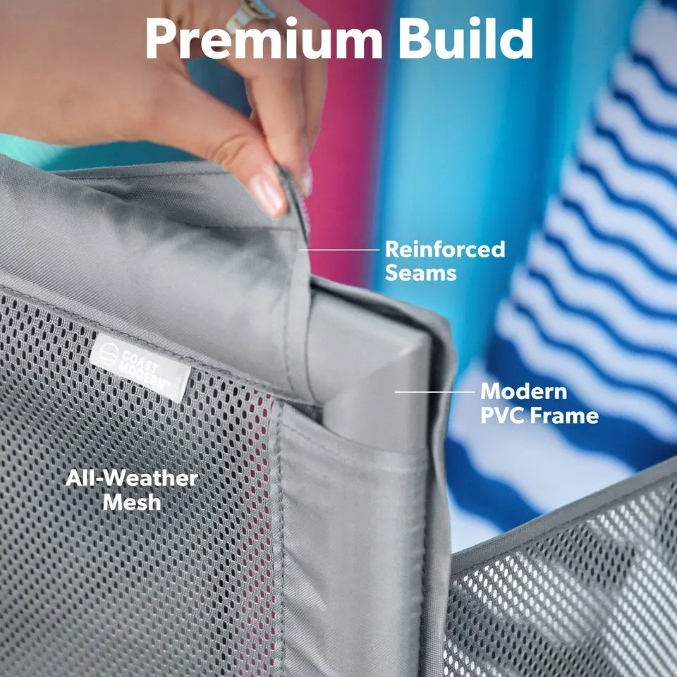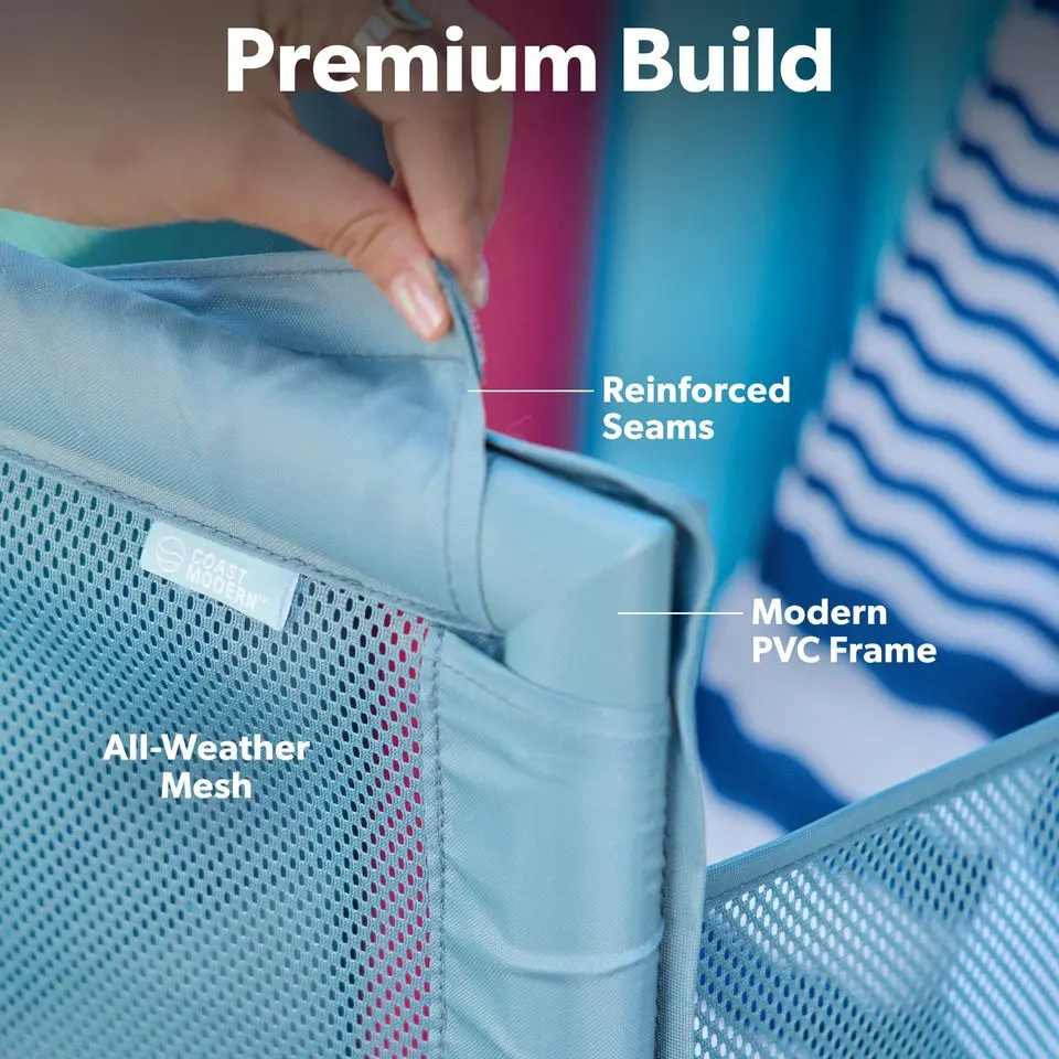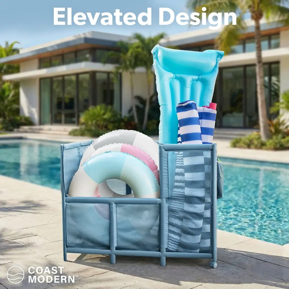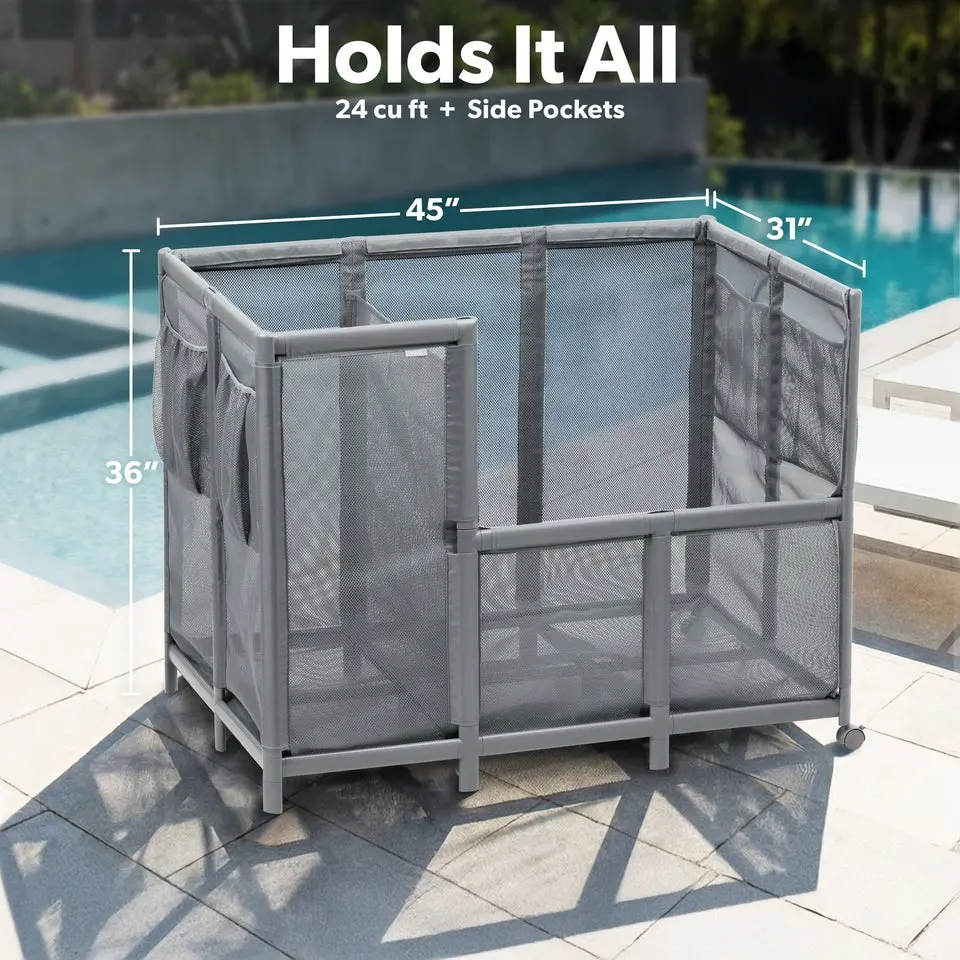 Now you can keep pool toys and accessories neatly organized and ready for the pool with Coast Modern Mesh Pool Storage Bin! Designed for both function and style, this pool organizer complements your poolside decor for an elevated experience. With 23.6 cubic feet of storage space, four pockets for small items, an attachable divider for tall gear, and locking wheels for easy transport, it holds everything you need for the perfect day by the water. This modern pool toy caddy is built from high-end all-weather materials to last season after season. It's a great alternative to flimsy and outdated pool float holders! Add sophistication to your backyard and experience superior pool organization and storage with Coast Modern Mesh Pool Storage Bin!