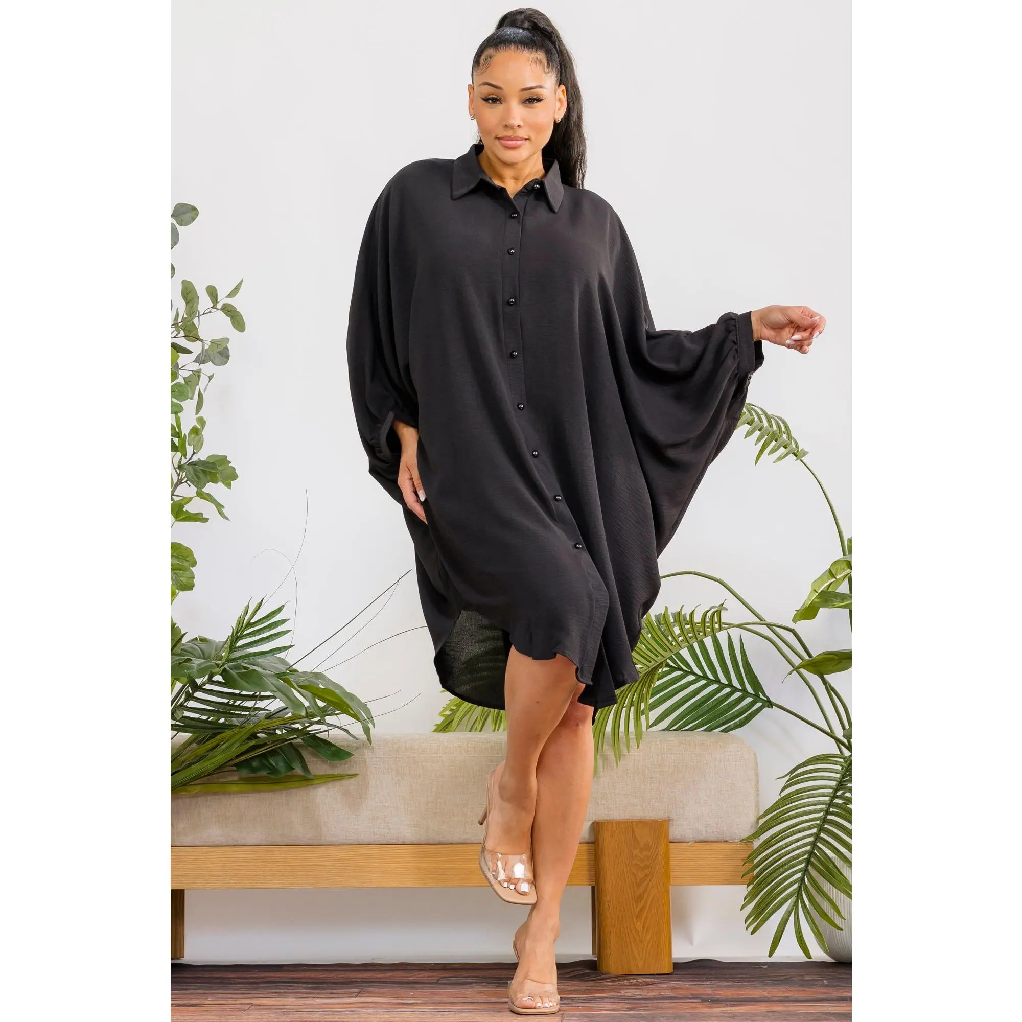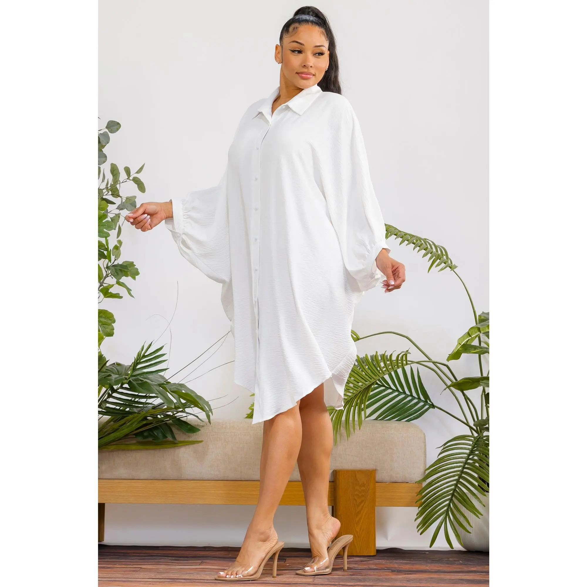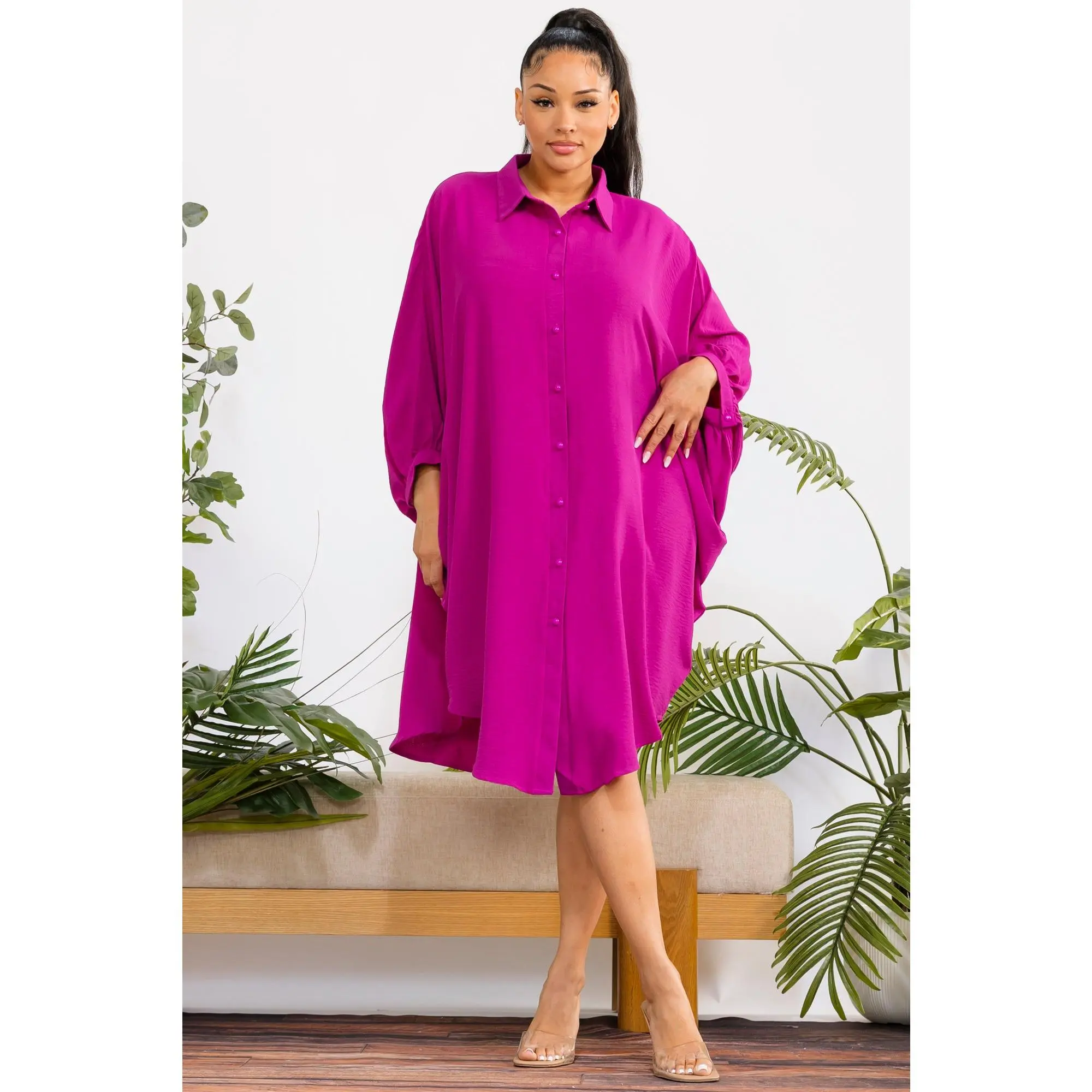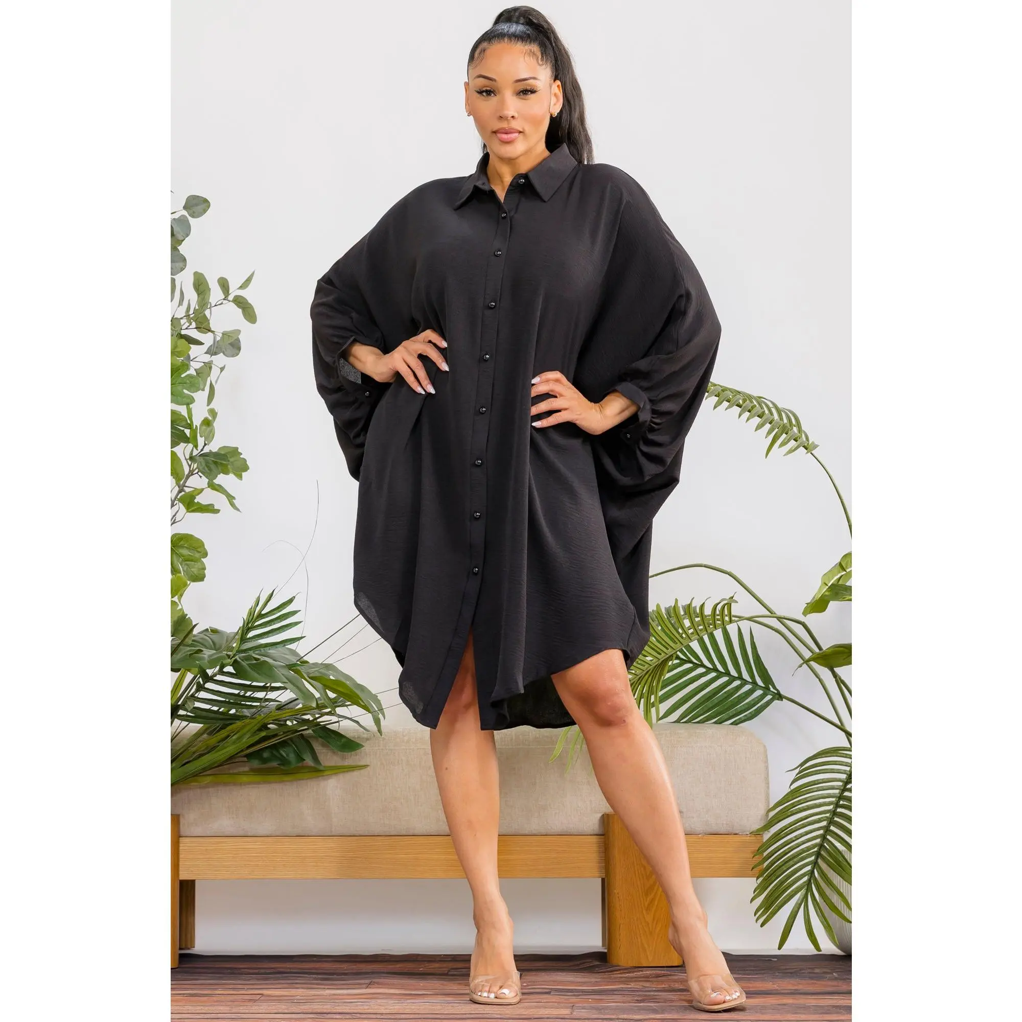 A timeless oversized shirt dress designed for effortless elegance and all-day comfort. With its fluid silhouette and classic button-down design, it delivers a refined yet relaxed look for any occasion.