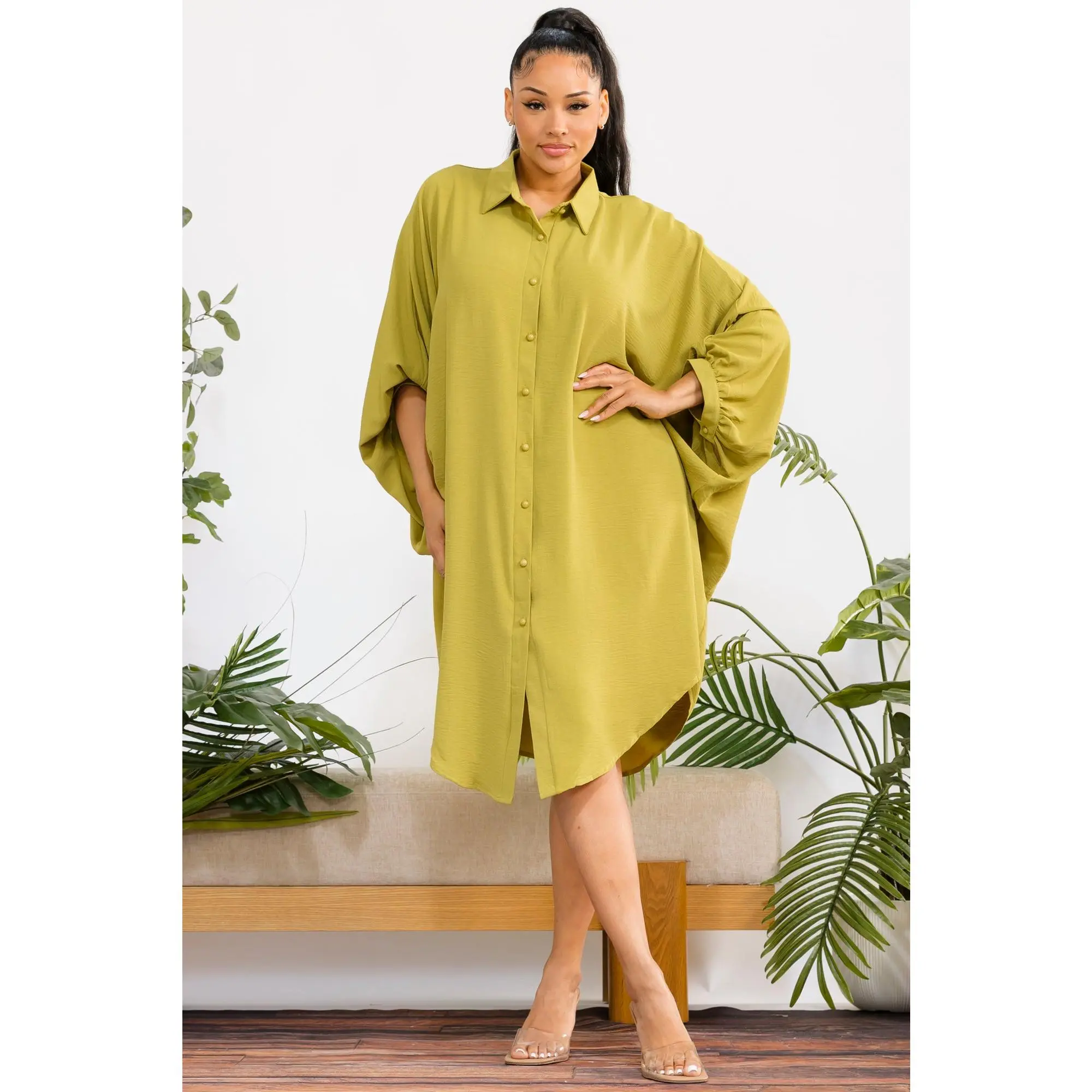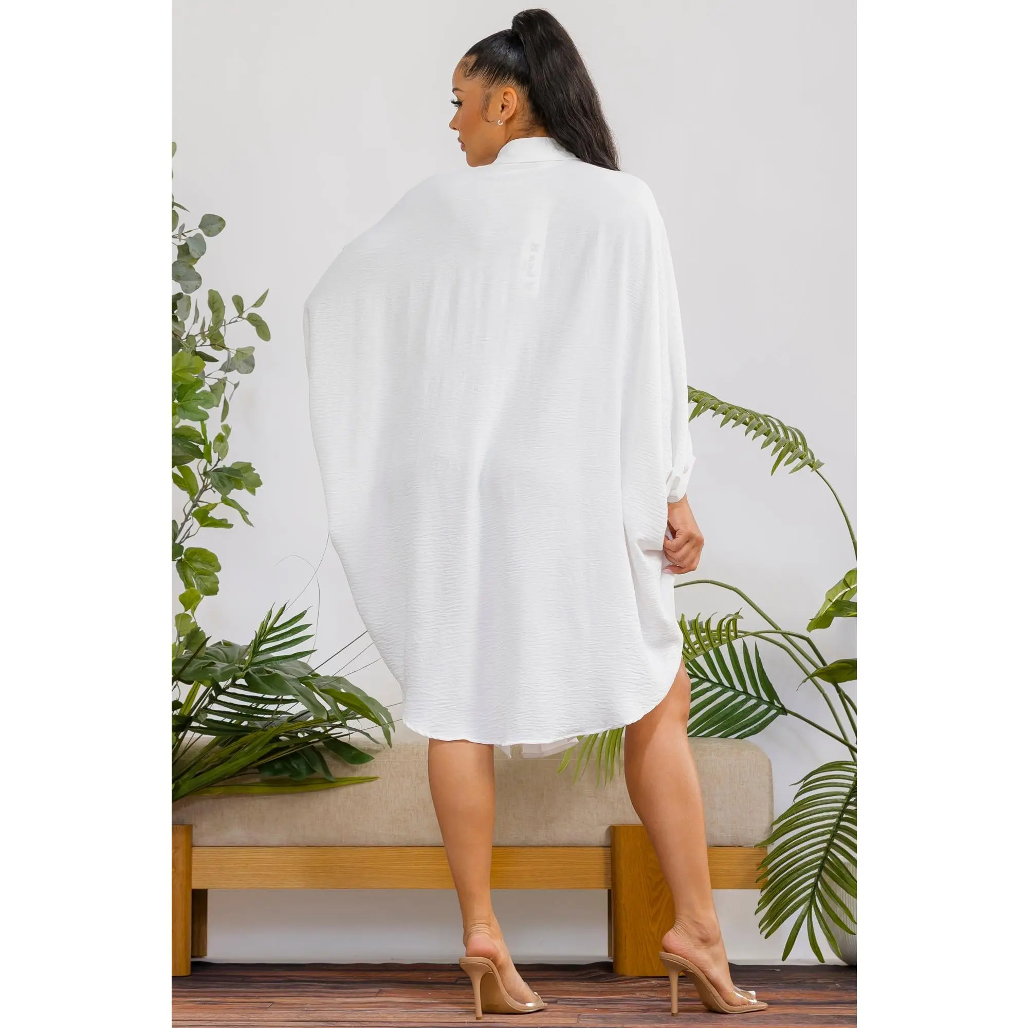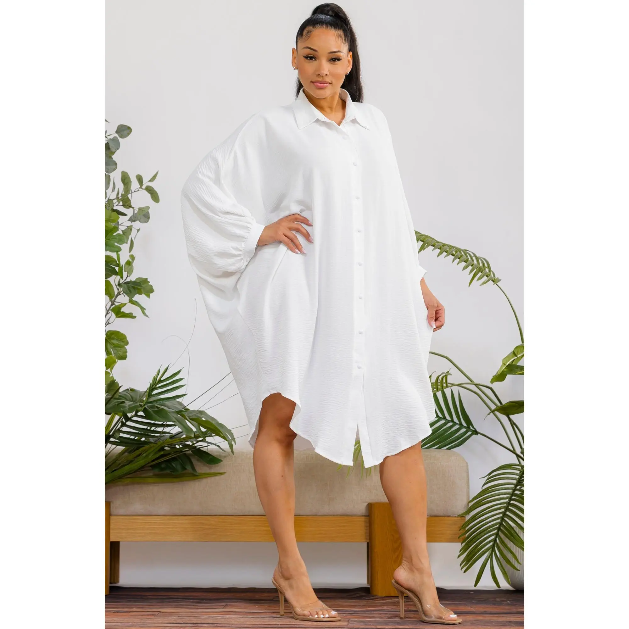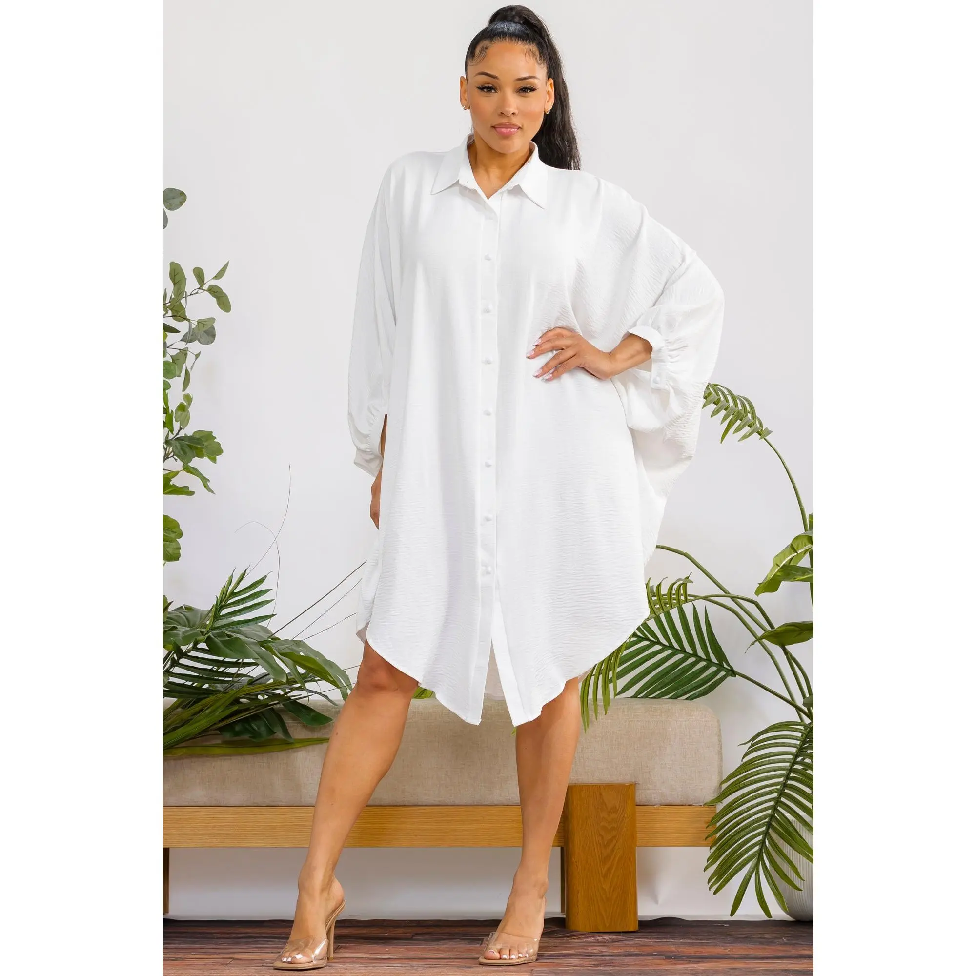 A timeless oversized shirt dress designed for effortless elegance and all-day comfort. With its fluid silhouette and classic button-down design, it delivers a refined yet relaxed look for any occasion.