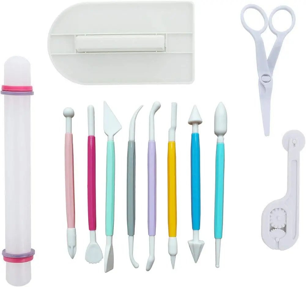 ·5 Sets (12pcs) include 8 pieces of modeling tools, 1 piece of cutter and embosser, 1 piece of cake smoother, 1 piece of decorating scissor, 1 piece of rolling pin