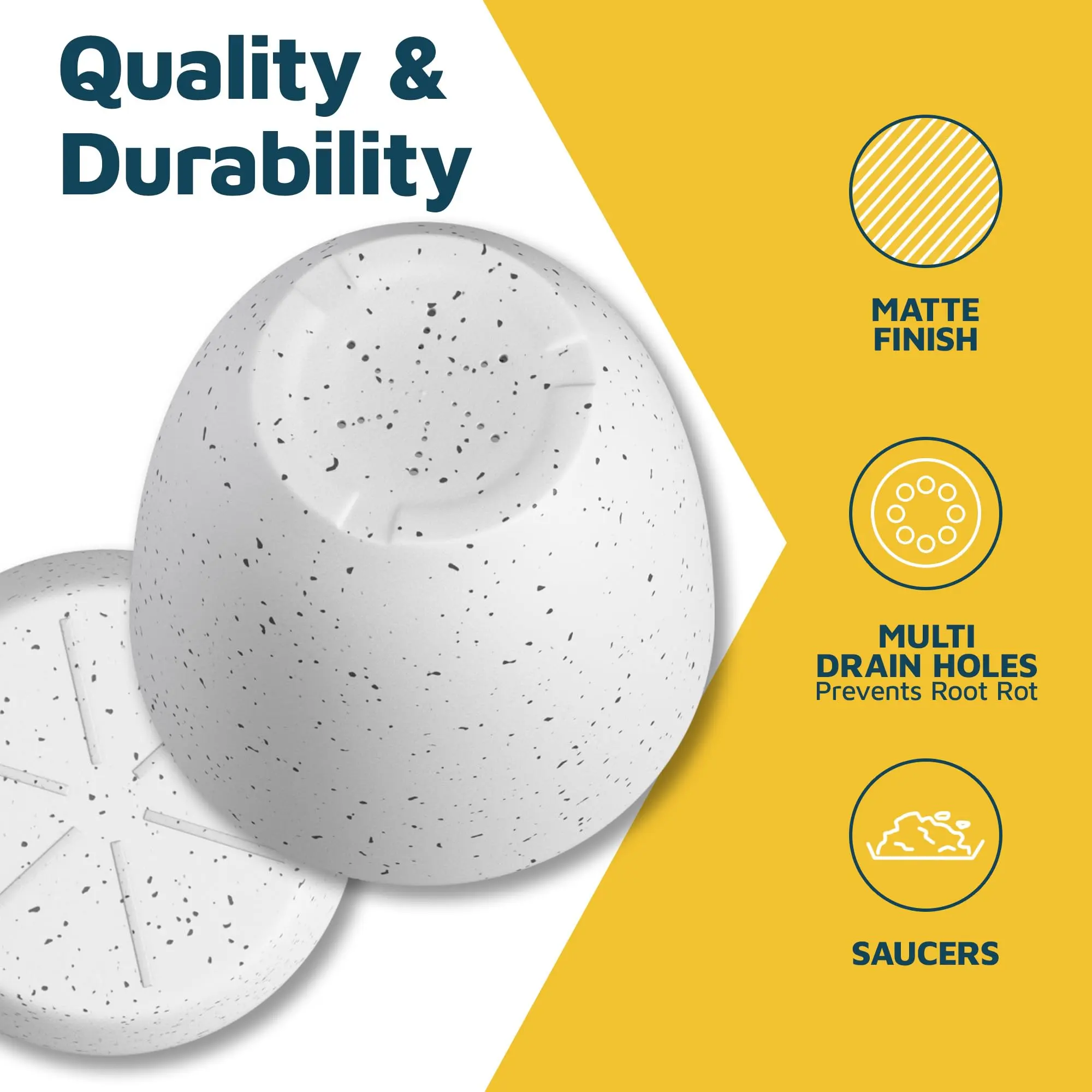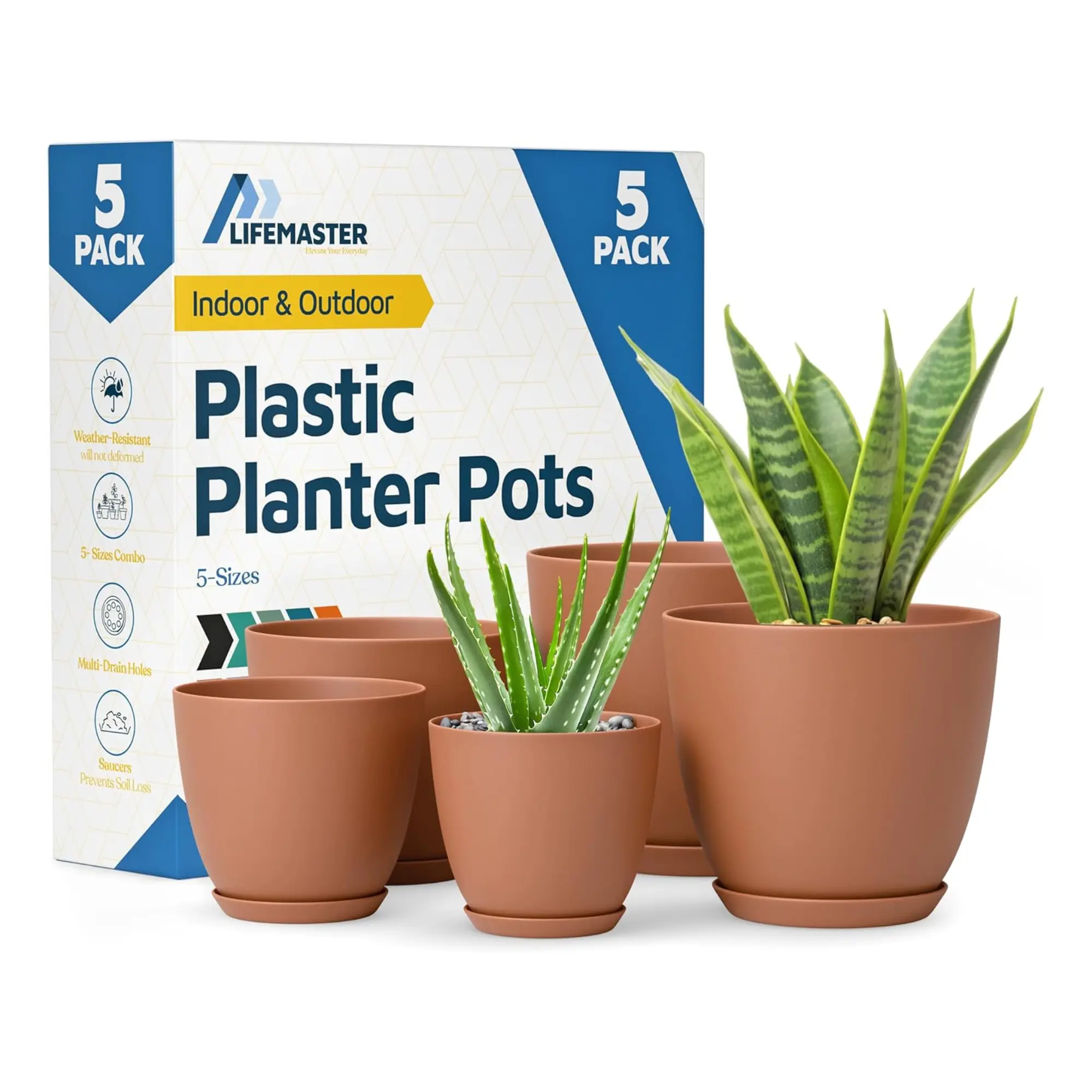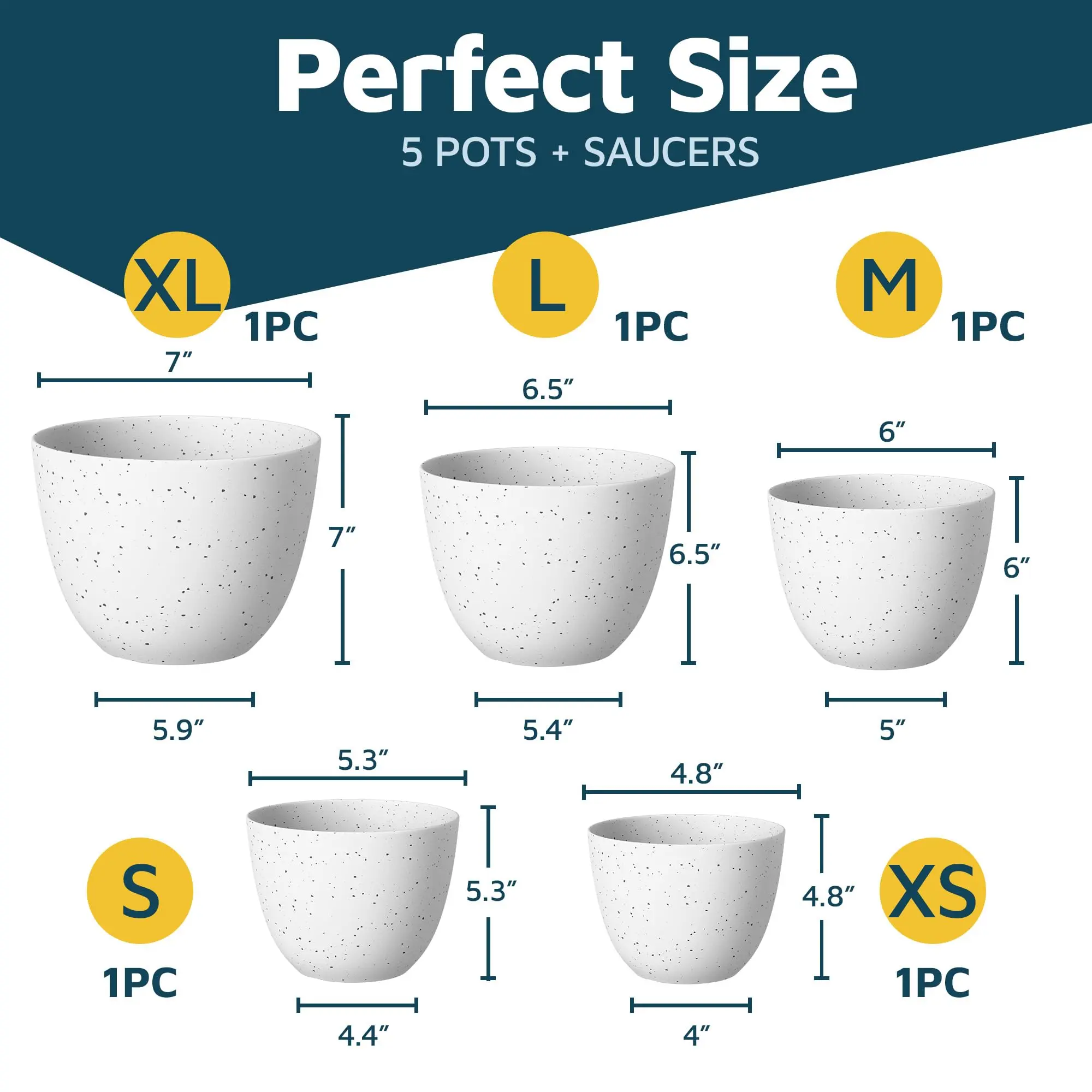 Plant Pots with Drainage Holes & Saucers 5 Pack, Indoor & Outdoor Stackable Space-Saving Planters for Houseplants & Flowers, (7", 6.7", 6", 5.3", and 4.8" Inches), Durable & Weatherproof