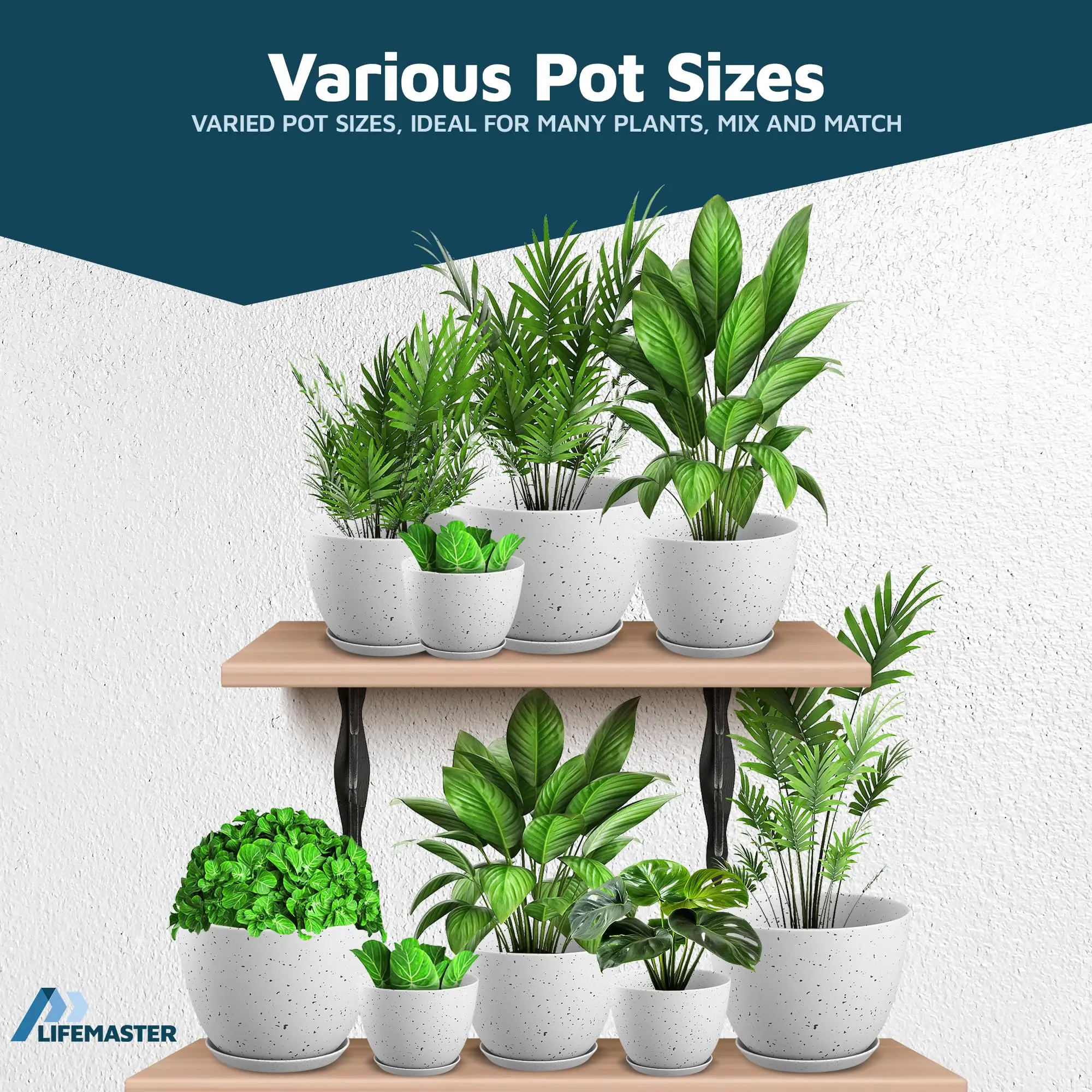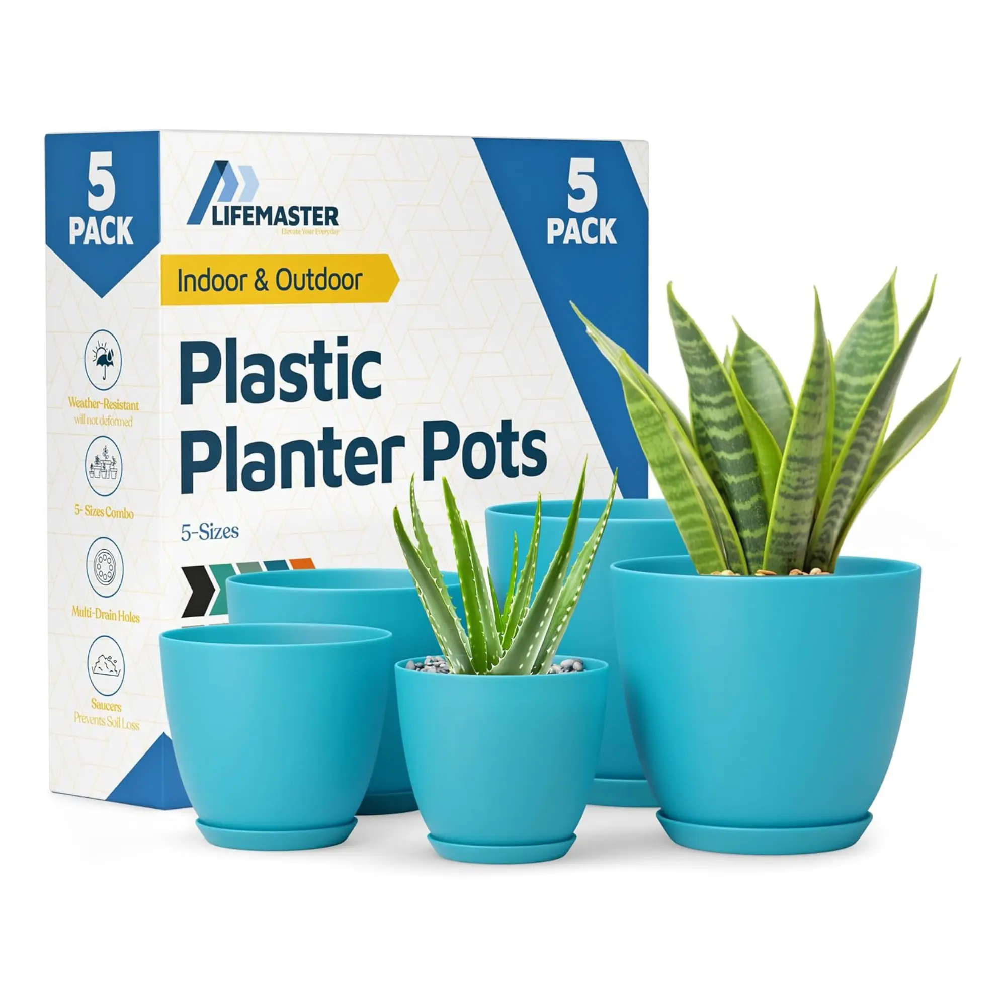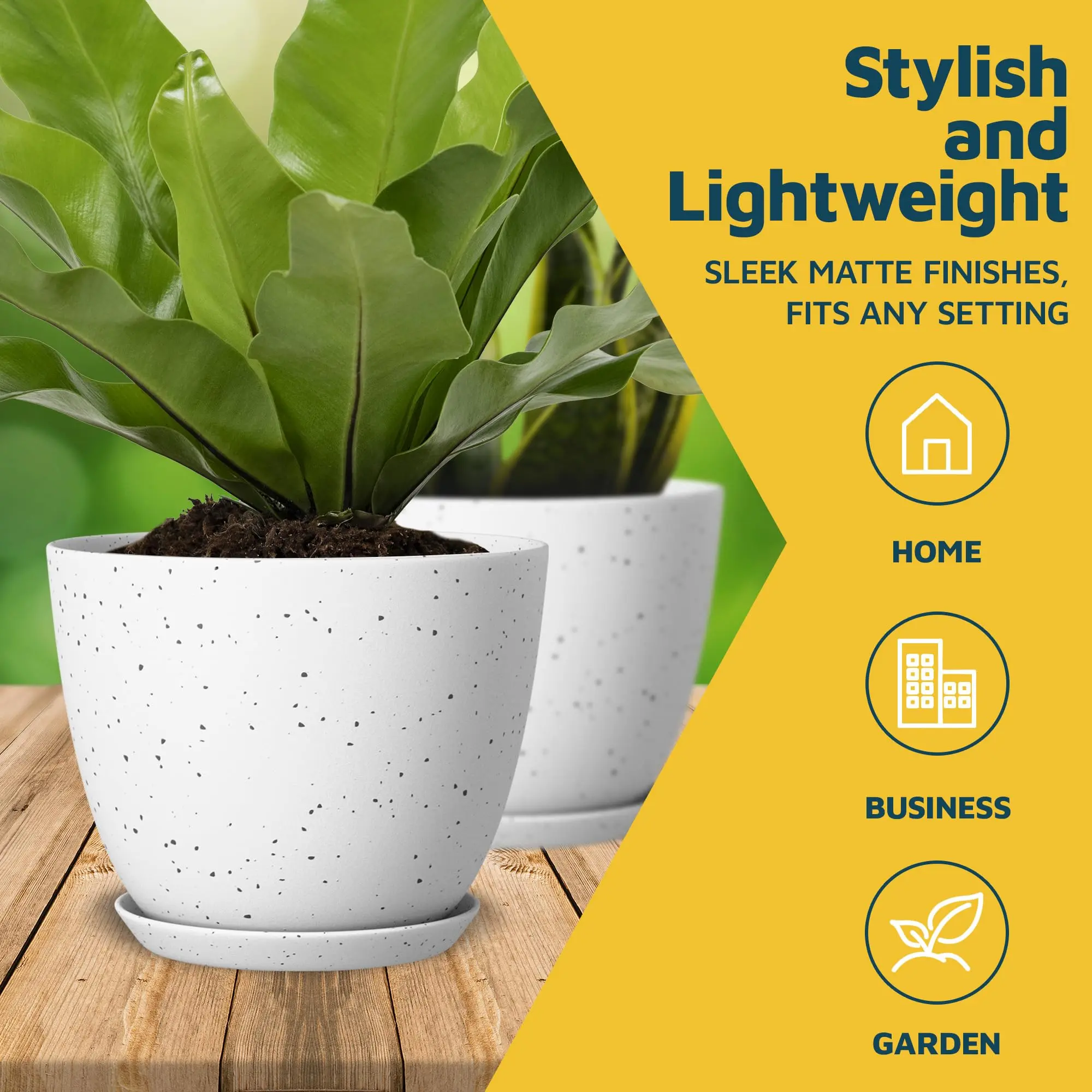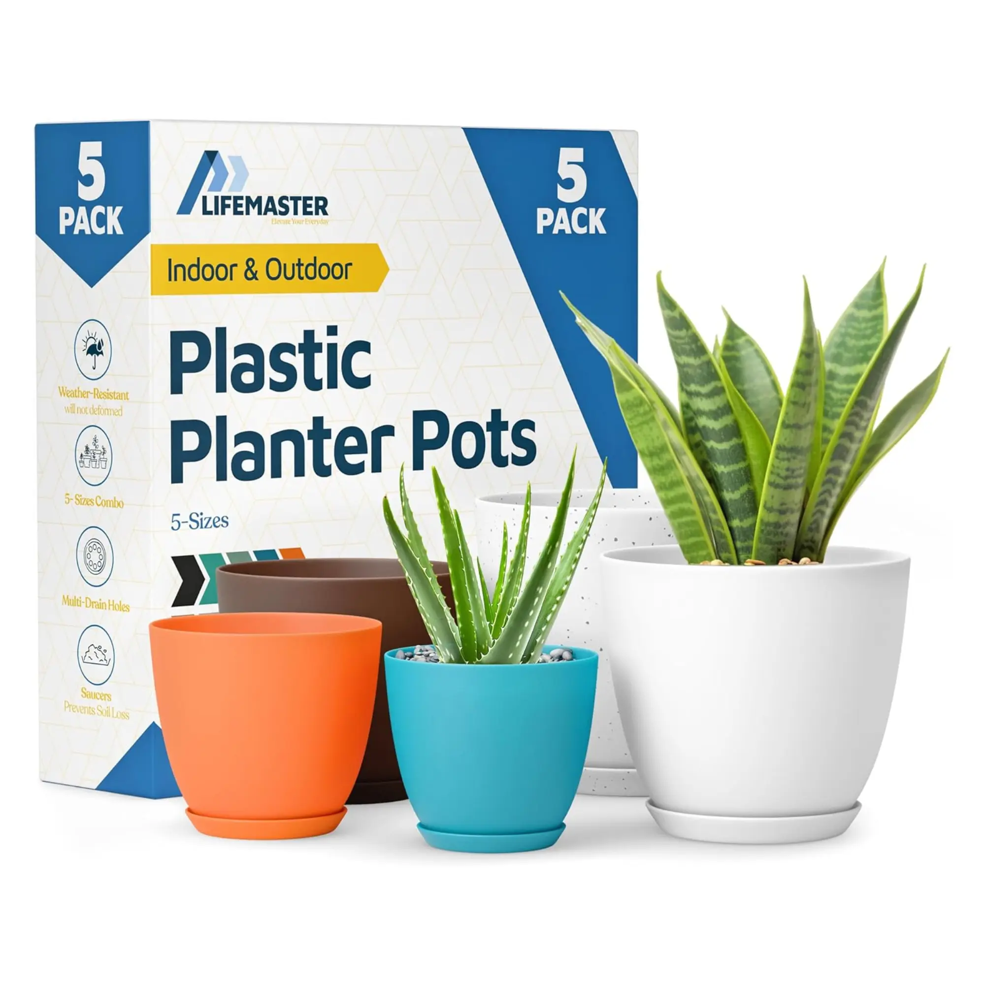 Plant Pots with Drainage Holes & Saucers 5 Pack, Indoor & Outdoor Stackable Space-Saving Planters for Houseplants & Flowers, (7", 6.7", 6", 5.3", and 4.8" Inches), Durable & Weatherproof