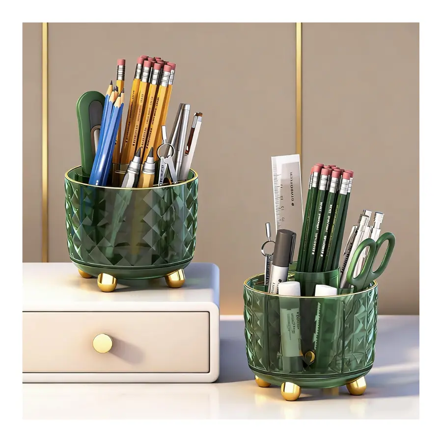 Elevate your desk with this Dark Green Rotating Pen Pencil Holder. It's a 360° pen organizer, perfect for keeping your office supplies tidy. With 6 compartments, it offers ample space for pens, pencils, and more. Ideal for any desk setup, this holder ensures your essentials are within reach.