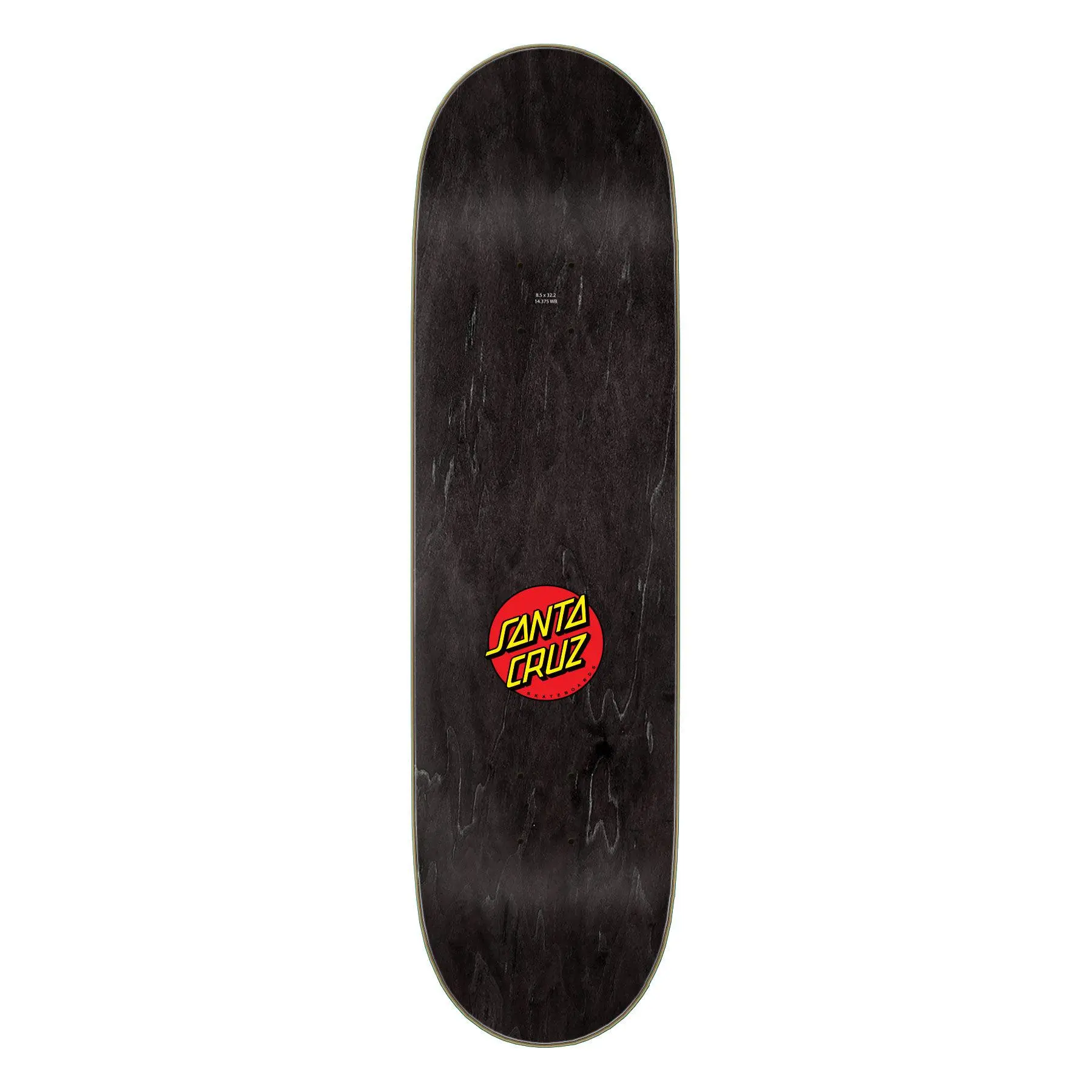 The Santa Cruz Skateboards Screaming Hand 8.5" x 32.2" deck features Santa Cruz Screaming Hand artwork on a black stain deck bottom and top with a 14.375" wheelbase.
