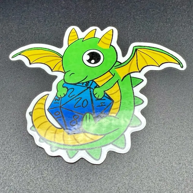 A dragon holding a d20 sticker. Available in glossy and holographic finish! ✨