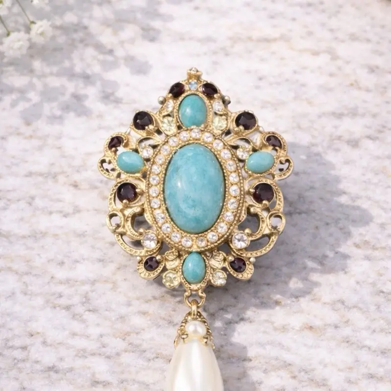 This elegant vintage-inspired brooch features a captivating turquoise centerpiece framed by delicate gold-tone filigree. Surrounding the central stone are sparkling clear crystals and deep wine-colored accents, while a graceful ivory pearl drop adds soft movement and refined charm.