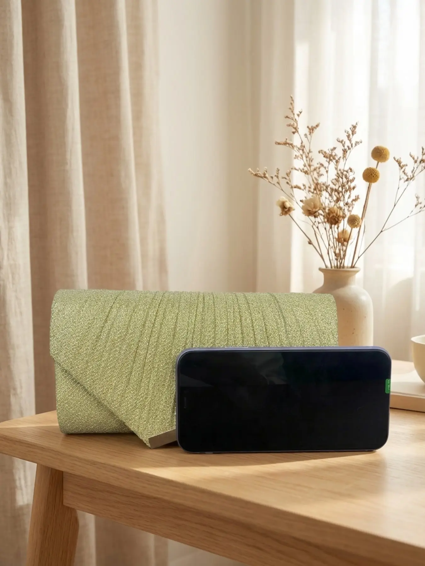 5. Trendy Light Glitter Pleated Clutch Bag, Silver Color Metal Trim, Elegant Evening Handbag for Party, Wedding & Prom