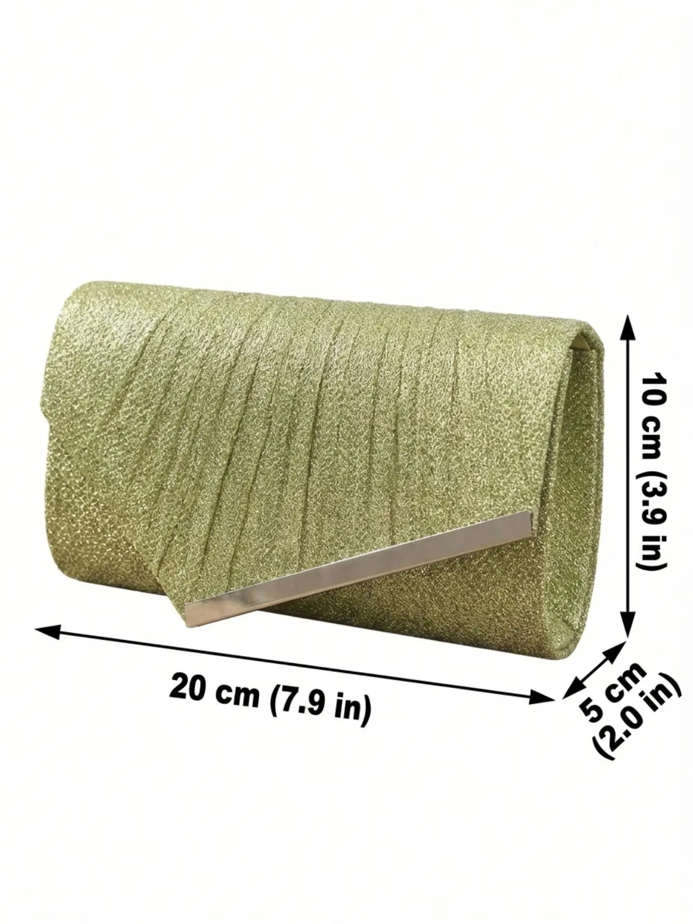 Trendy Light Glitter Pleated Clutch Bag, Silver Color Metal Trim, Elegant Evening Handbag for Party, Wedding & Prom