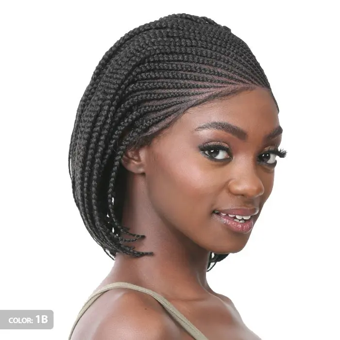 SHOWN COLOR: 1B BRAND: It's a Wig TYPE: Lace Front Wig STYLE: Box Braid MATERIAL: Synthetic Hair LENGTH: 14"