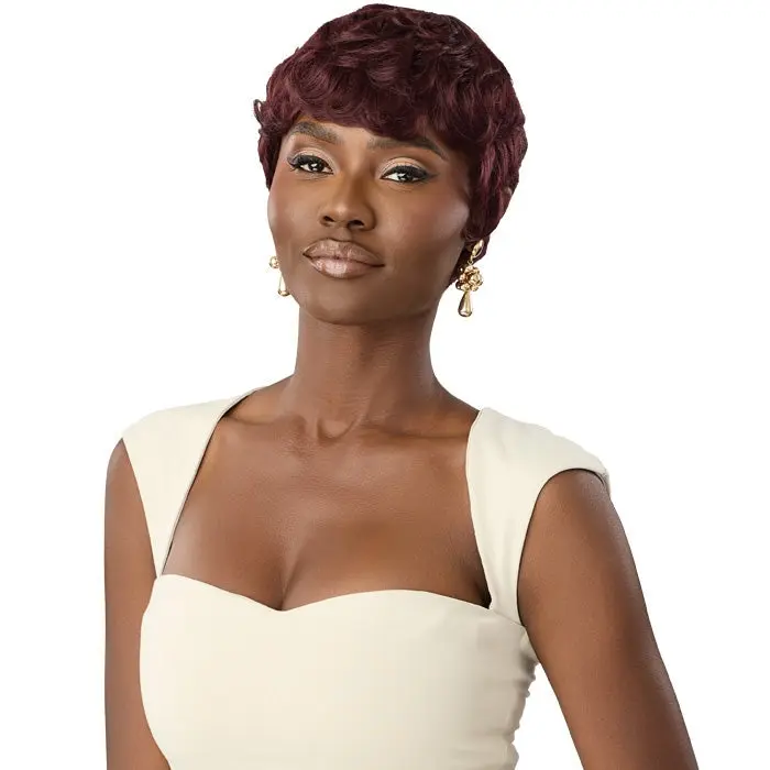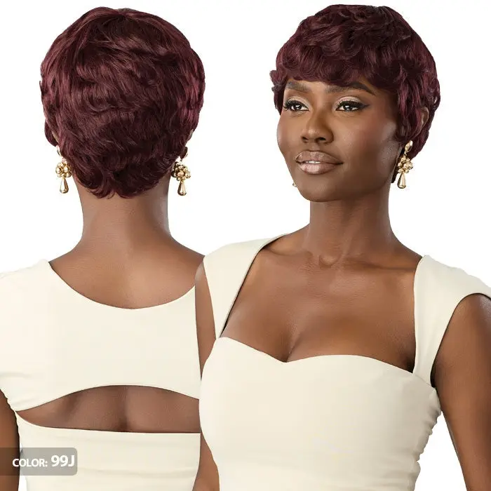 SHOWN COLOR: 99J, DR27 BRAND: Outre TYPE: Full Wig STYLE: Wavy Pixie MATERIAL: Human Hair LENGTH: Short