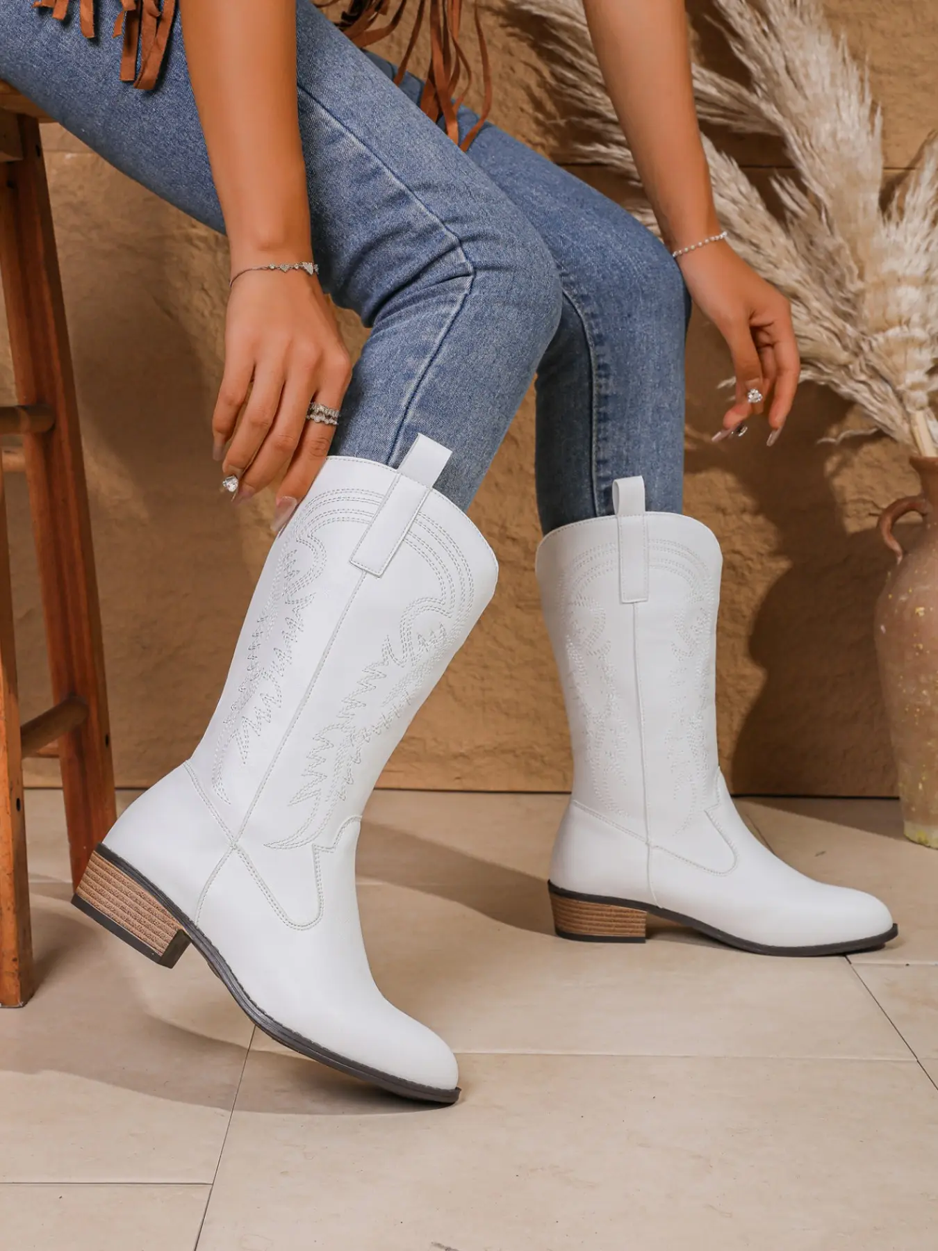 5. American Vintage Style Classic Western Embroidered Mid-Calf Boots, PU Leather, Rubber Sole, Fashion Winter Shoes, Slimming Effect