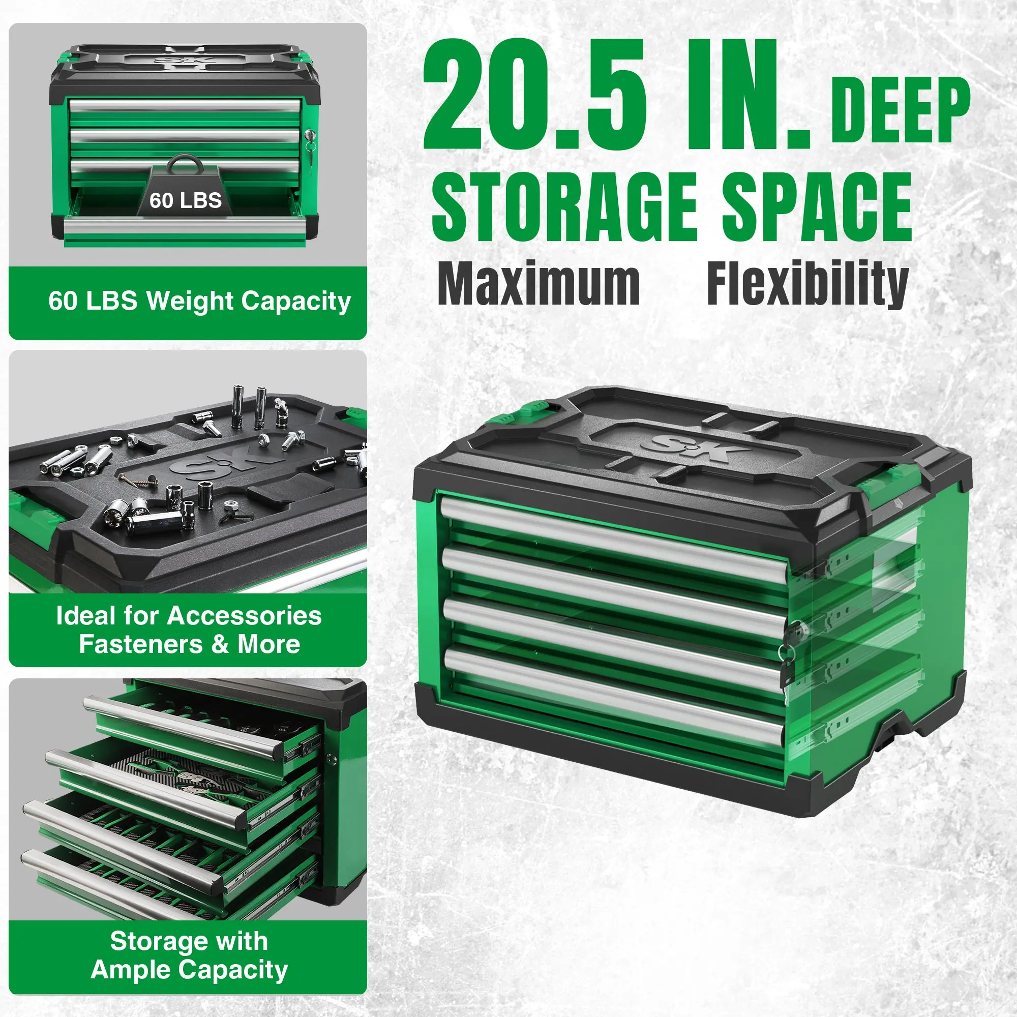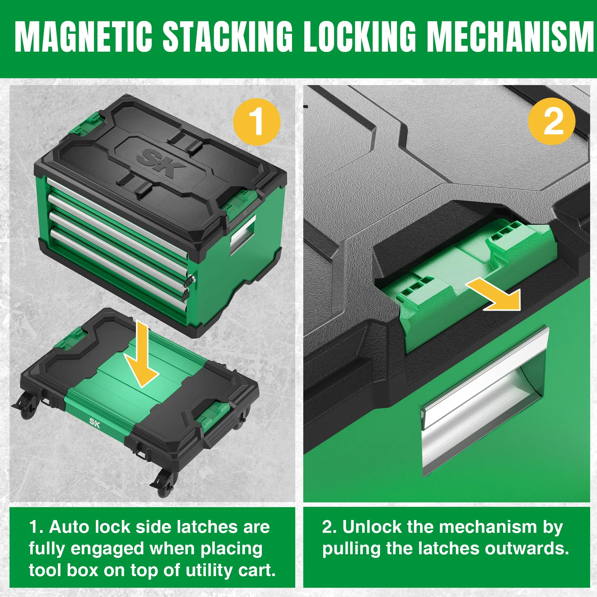 ·Expand your tool storage system with steel boxes and cabinets that provide space-saving organization and mobility. These units can be combined with a dolly cart and easily stacked onto any existing SK stacking module, allowing you to customize your tool storage solution according to your specific needs.