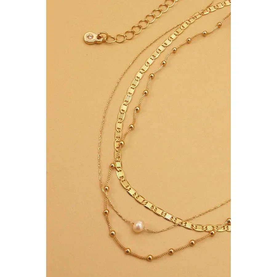 Features a stunning three layered necklace centered by an pearl charm. Second and third layer is a unique choker chains.
