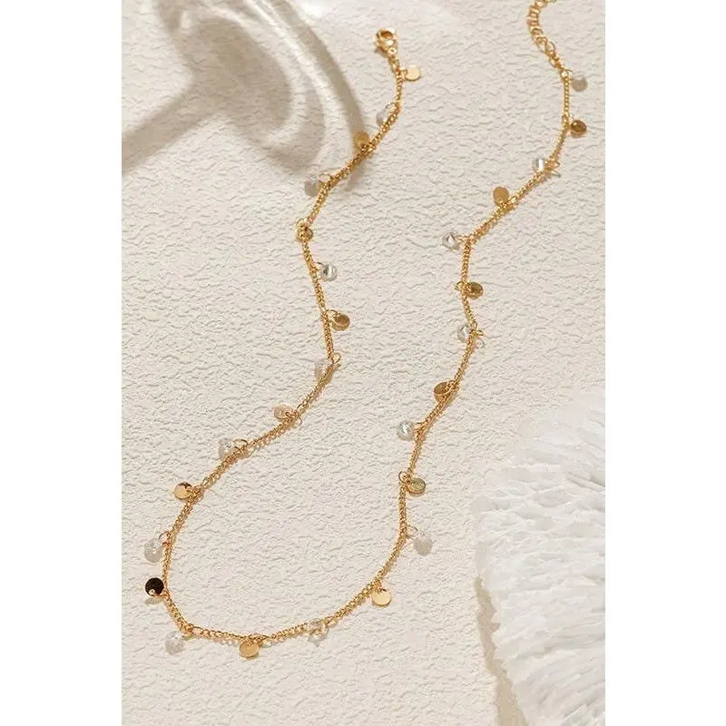 Crafted from premium stainless steel with a luxurious 18K gold finish, this non-tarnish necklace features an elegant design of suspended beads and discs stationed along a delicate chain.