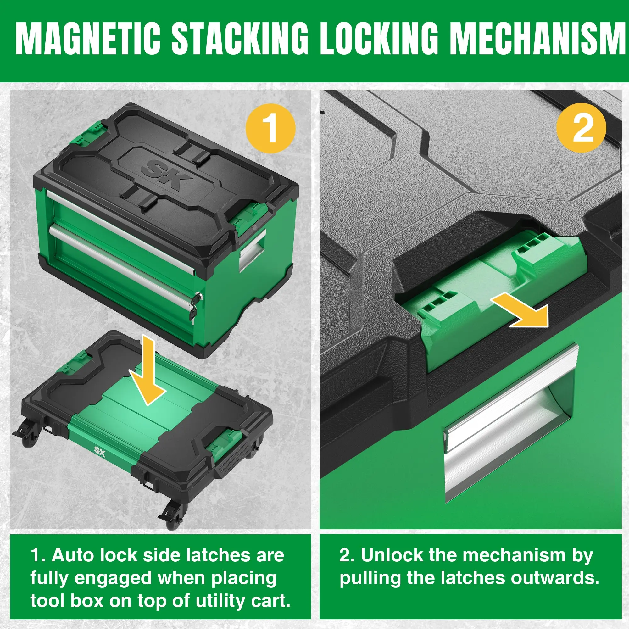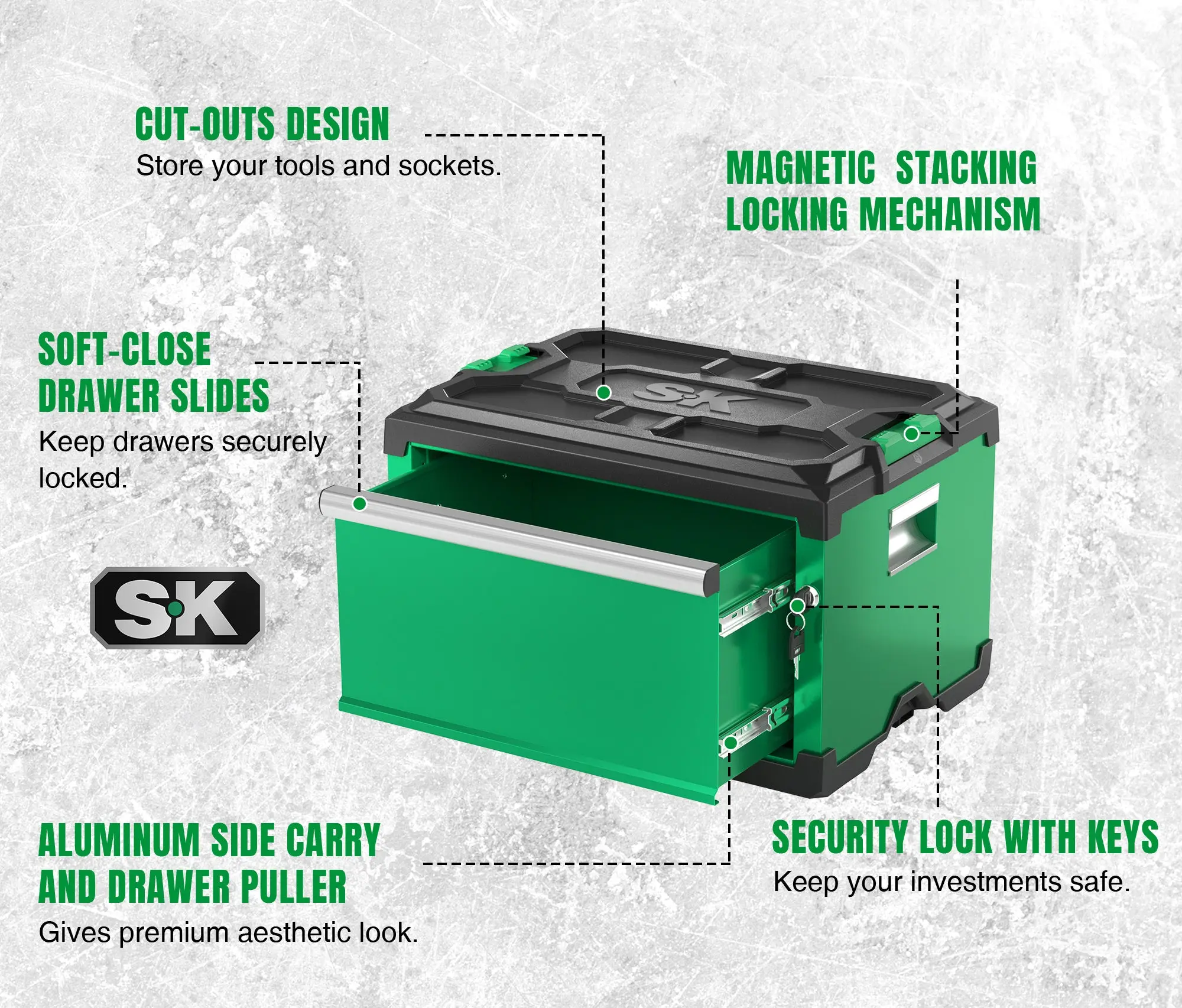 · Expand your tool storage system with steel boxes and cabinets that provide space-saving organization and mobility. These units can be combined with a dolly cart and easily stacked onto any existing SK stacking module, allowing you to customize your tool storage solution according to your specific needs.