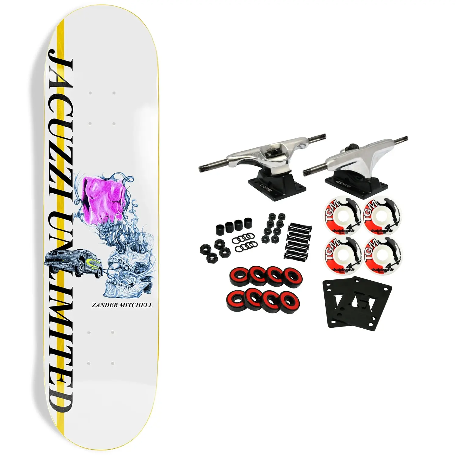 Split top color veneers. Mellow Concave, Steep Kick. 7-ply 100% North American Maple with Epoxy Glue. This board measures 8.125" x 32" with a 14.25" wheelbase. Comes with Core trucks, 52mm TGM logo wheels, Amp abec 5 bearings, Black Diamond Griptape, risers, and hardware. Core trucks are light weight and feature heavy duty aluminum with grade 8 steel kingpins and axles, as well as USA made bushings and pivot cups. 52mm 99A are the perfect wheels for both street and park skating. Like the name states, Amp bearings are stimulants for your wheels! Light synthetic oil, Delrin Crowns, and Rubber Serviceable Shields are a few of the things that makes these bearings one of the best Abec 5 rated bearings on the market. Arrives un-assembled which allows for customization and a feeling of accomplishment. Skaters love building their boards! Easy to assemble!