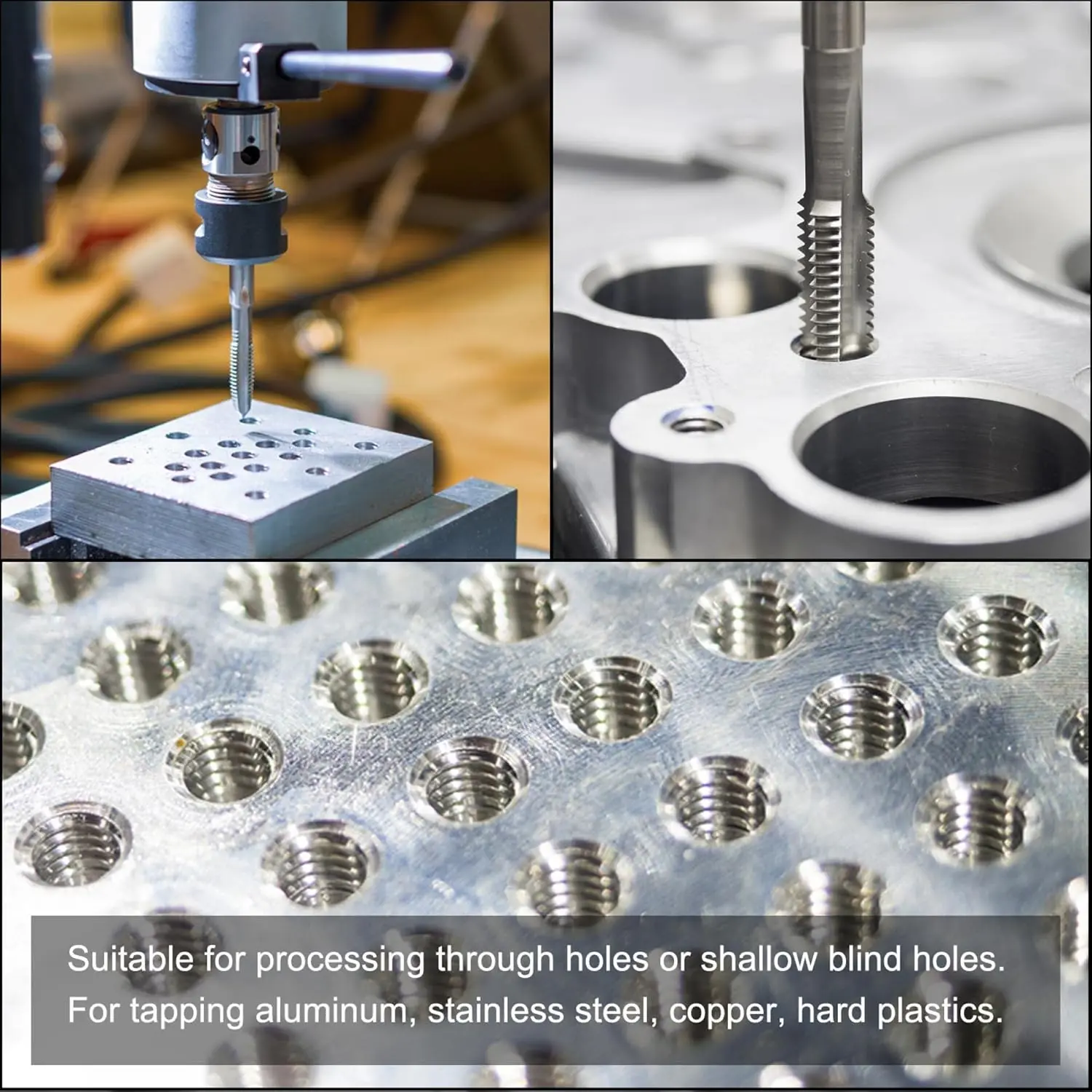 ·Applications: Suitable for processing through holes or shallow blind holes . Used for drilling and tapping aluminum, stainless steel, copper, hard plastics, etc.. Use with tapping oil to get higher quality threads and more durable taps.