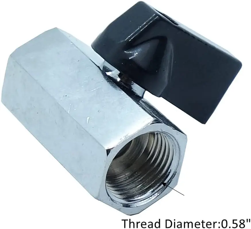 Material: Chrome Plated Brass Lever handle for on/off manual control Thread I.D: 0.58" Package Includes : 2pcs 3/8 mini Ball Valve Mini ball valves are used in air, gas, liquid, and steam applications.
