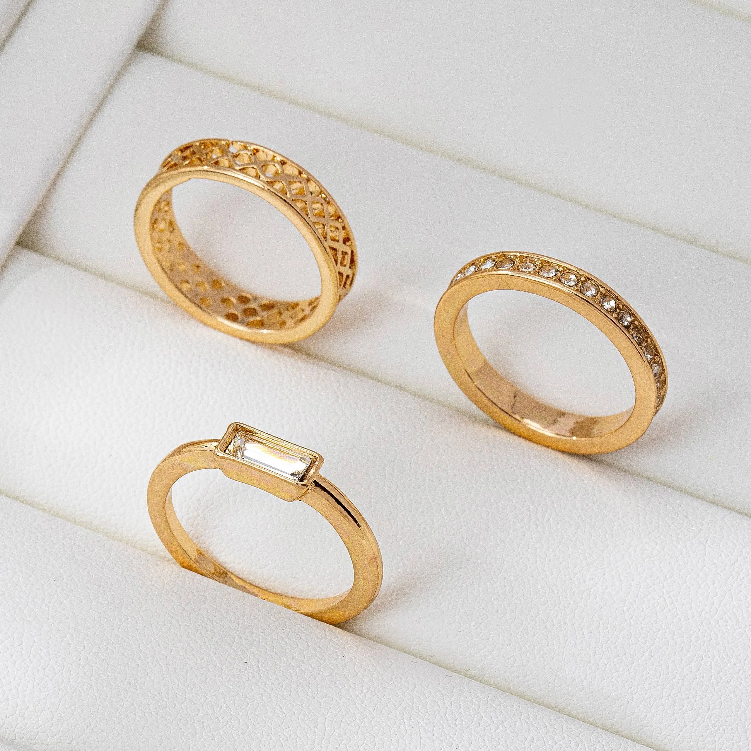 Mix and match with this chic set of three gold-tone rings, featuring a lattice-textured band for subtle pattern, a slim pavé crystal eternity ring for all-around sparkle, and a sleek solitaire with a rectangular baguette crystal. details: size: 7