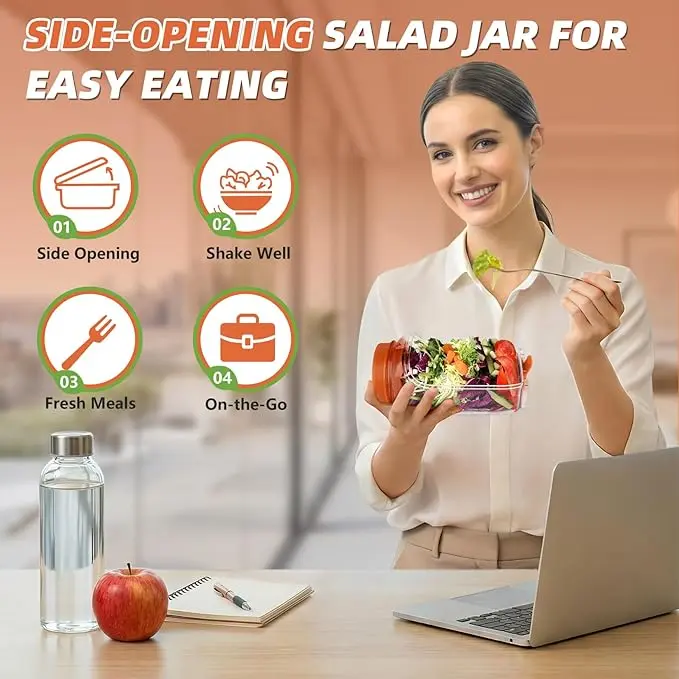 This salad jar comes with a leak-proof dressing cup, adding convenience to your meal prep. The side opening allows easy access to your salad without spilling. Durable and reliable, it's ideal for daily use. Keep your salads fresh and organized with this practical container.