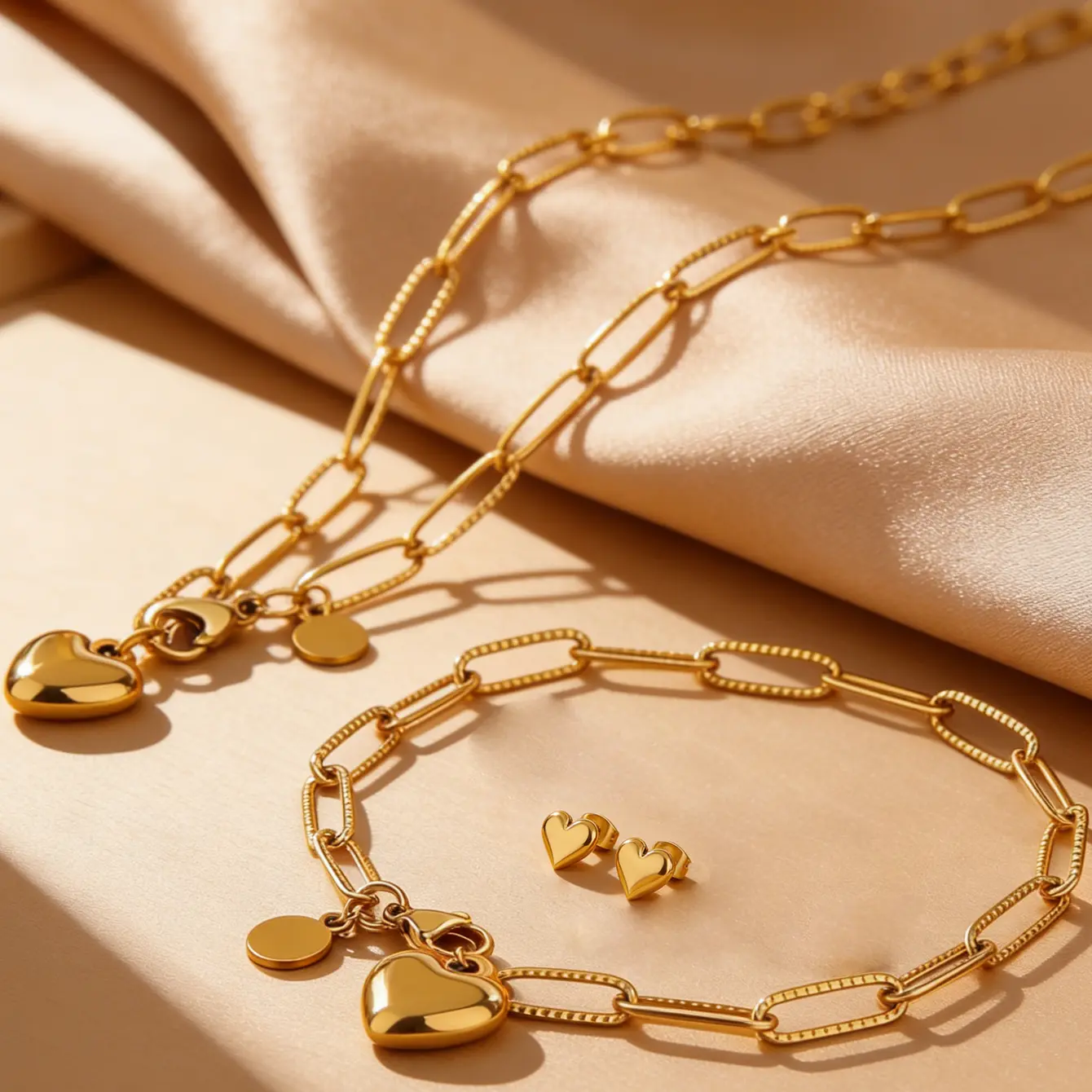 Elegant gold stainless steel jewelry set for women. Includes necklace, bracelet, and earrings.
