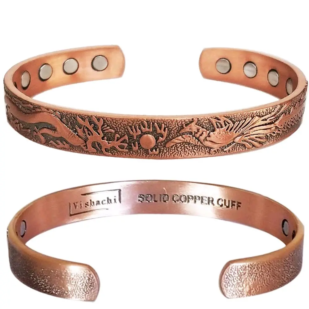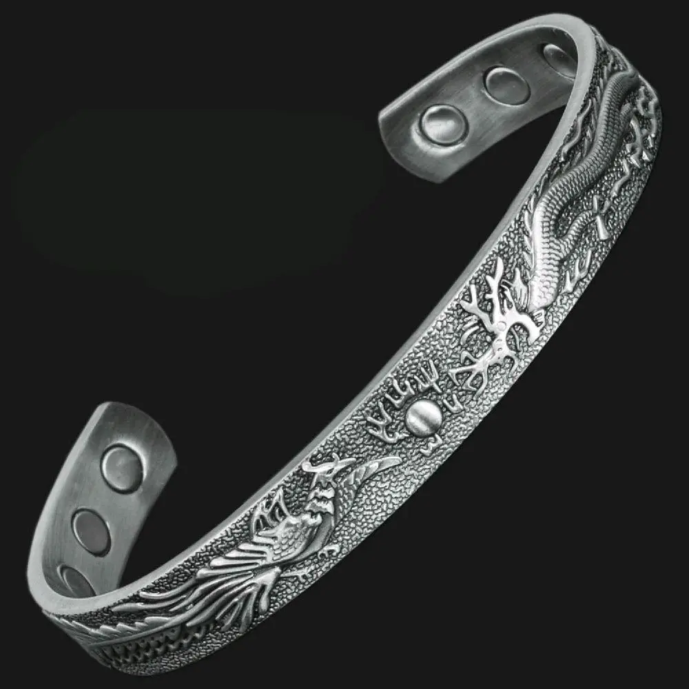 Dragon & Phoenix pure & solid copper magnetic bracelet bangle with 6 neodymium magnets for potential therapeutic benefits. One size fits all design. It is an excellent quality bracelet