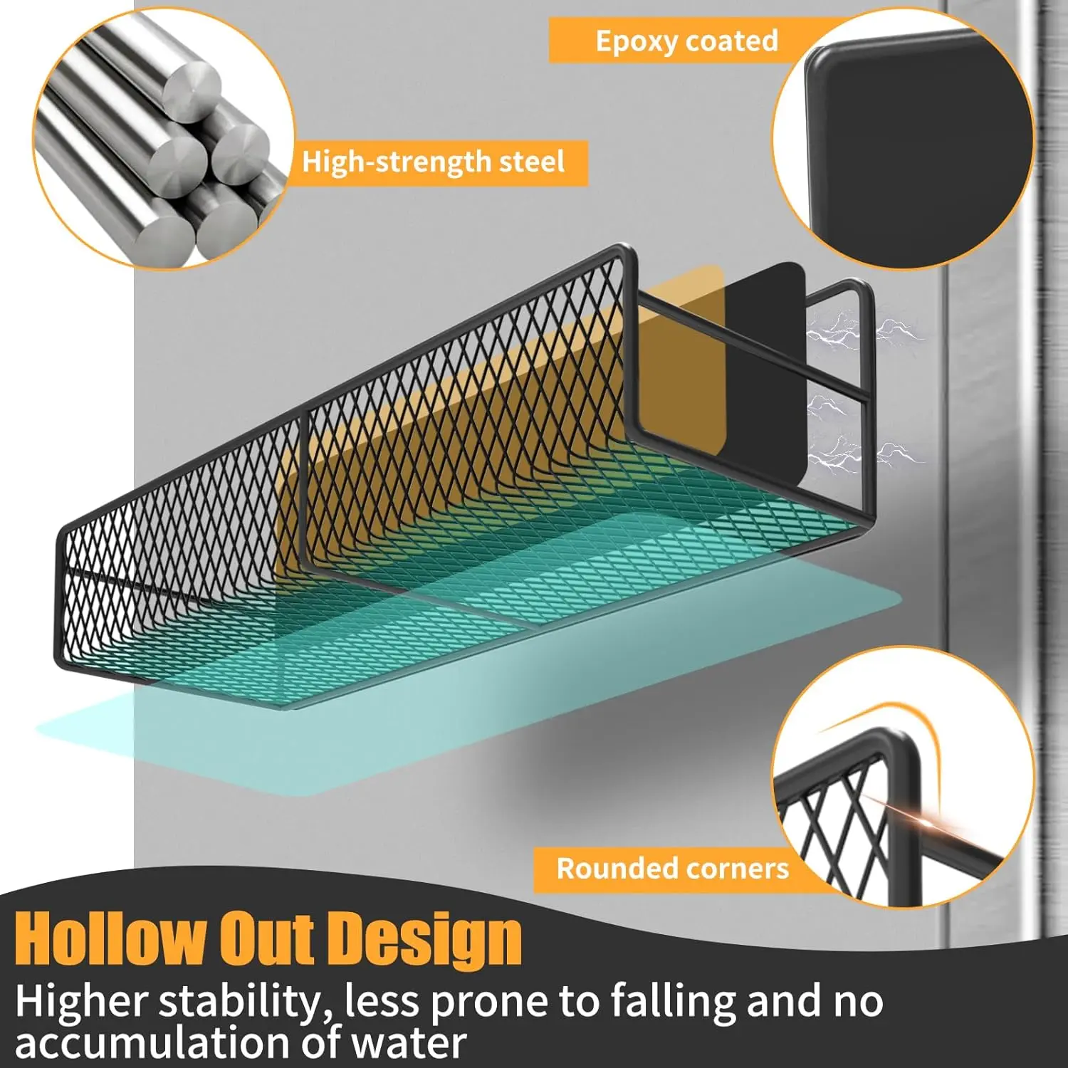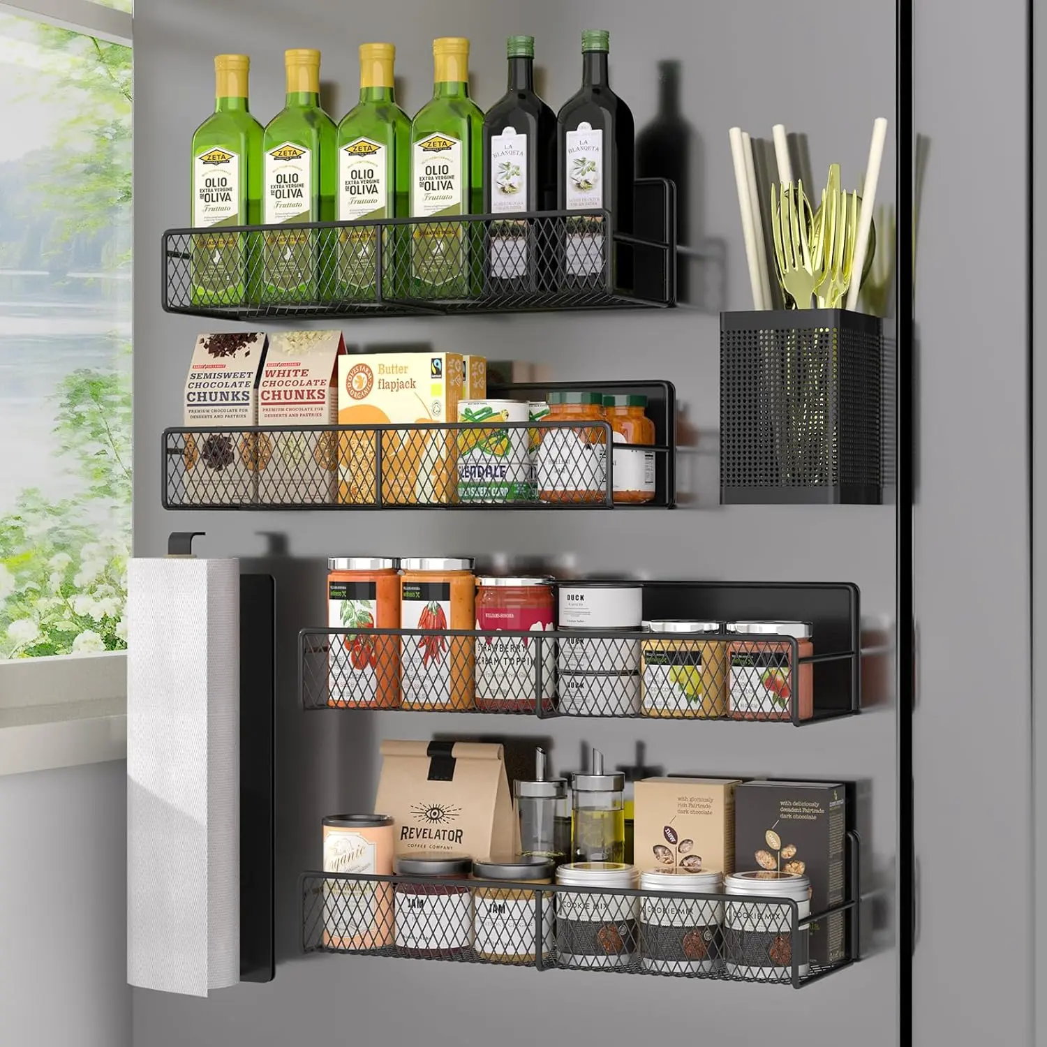 6 piece magnetic kitchen helper is your all in one storage solution. Includes 2 large racks 2 medium racks 1 paper towel holder and 1 utensil caddy. Made with 4.5mm thick steel frames 100 percent metal structure 2x thicker than plastic rivals. Smooth epoxy coating resists water oil and rust just wipe clean. Smart diamond grid design keeps spices in place with air flow. Powerful rubber magnets hold tight to any metal surface no drilling needed. Perfect for kitchen laundry room office or RV. Stack vertically or spread out for easy access.