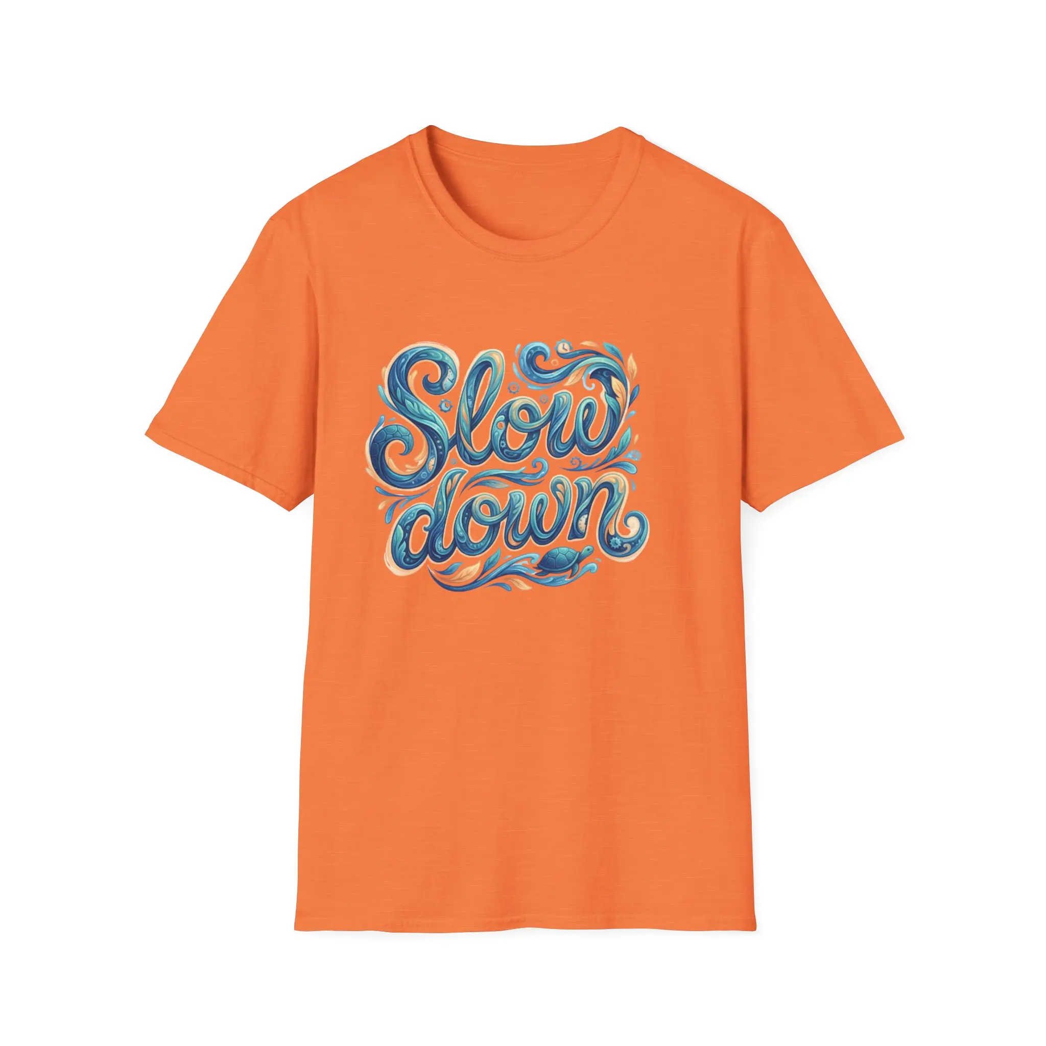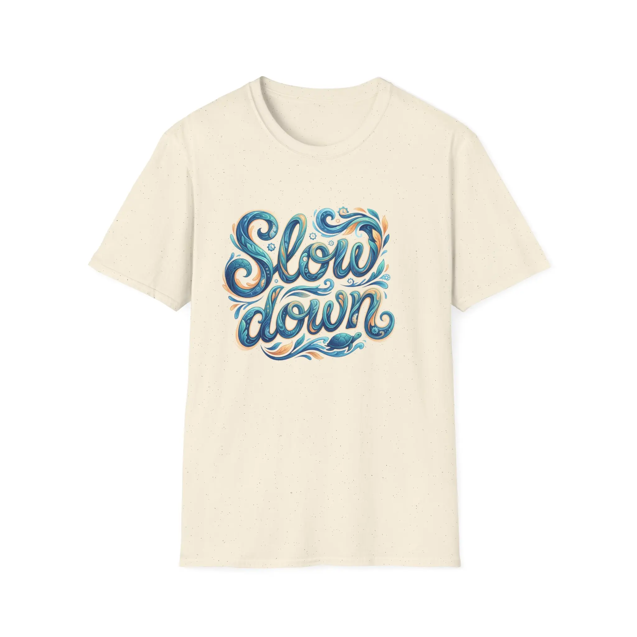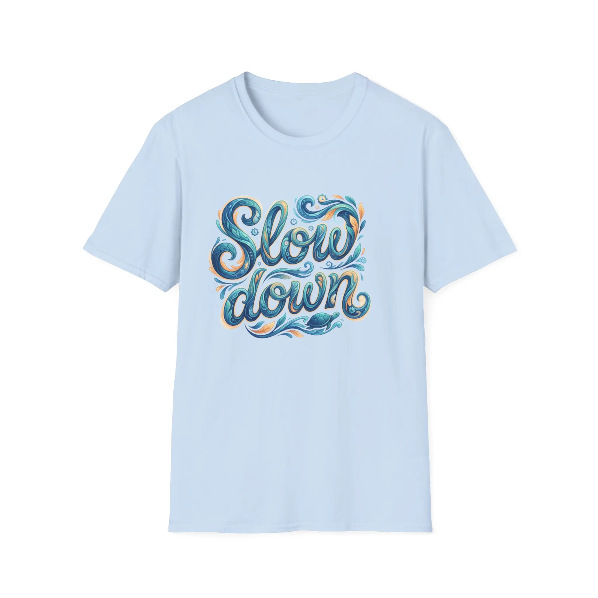 This lightweight cotton tee carries a calm, hand-lettered message — “Slow down” painted in flowing blue-and-gold brushstrokes. The lettering feels like a gentle tide, soft curves and tiny flourishes that invite a quiet pause. Wear it on slow mornings, long walks, or when you need a wearable reminder to breathe. The shirt’s clean crew neckline and classic fit keep the design the focus while the soft, ring-spun cotton sits comfortable against skin. It pairs naturally with linen trousers, worn denim, or a favorite cardigan for layered, relaxed outfits that whisper ease rather than shout style.