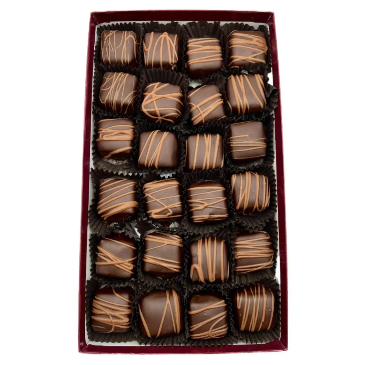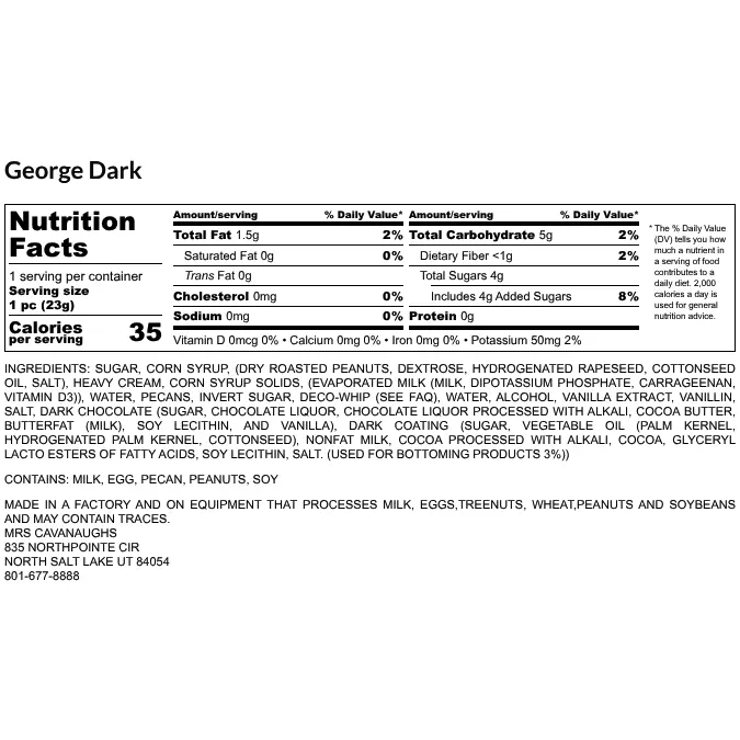 | Ingredients | Ingredients: Sugar, Corn Syrup, (Dry Roasted Peanuts, Dextrose, Hydrogenated Rapeseed, Cottonseed oil, Salt), Heavy Cream, Corn Syrup Solids, (Evaporated Milk (Milk, Dipotassium Phosphate, Carrageenan, Vitamin D3)), Water, Pecans, invert sugar, MERINGUE POWDER (DRIED EGG WHITES, FOOD STARCH-MODIFIED, SUGAR, CORN STARCH, LEAVENING (POTASSIUM ALUMINUM PHOSPHATE, CREAM OF TARTAR, MONOCALCIUM PHOSPHATE), GUM ARABIC. CONTAINS 2% OR LESS OF EACH OF THE FOLLOWING: GELATIN, LOCUST BEAN GUM, NATURAL & ARTIFICIAL FLAVORS.), Water, Alcohol, Vanilla Extract, Vanillin, Salt, Milk Chocolate (Sugar, milk, cocoa butter, chocolate liquor, soy lecithin, and vanilla), Milk Coating (Sugar, palm kernel oil, hydrogenated palm kernel and palm oils, nonfat dry milk, cocoa, soy lecithin, salt, and artificial flavoring. (used for bottoming products 3%)) Contains: Milk, Egg, Pecan, Peanuts, Soy,Ingredients: Sugar, Corn Syrup, (Dry Roasted Peanuts, Dextrose, Hydrogenated Rapeseed, Cottonseed oil, Salt), Heavy Cream, Corn Syrup Solids, (Evaporated Milk (Milk, Dipotassium Phosphate, Carrageenan, Vitamin D3)), Water, Pecans, invert sugar, MERINGUE POWDER (DRIED EGG WHITES, FOOD STARCH-MODIFIED, SUGAR, CORN STARCH, LEAVENING (POTASSIUM ALUMINUM PHOSPHATE, CREAM OF TARTAR, MONOCALCIUM PHOSPHATE), GUM ARABIC. CONTAINS 2% OR LESS OF EACH OF THE FOLLOWING: GELATIN, LOCUST BEAN GUM, NATURAL & ARTIFICIAL FLAVORS.), Water, Alcohol, Vanilla Extract, Vanillin, Salt, Dark Chocolate (Sugar, chocolate liquor, chocolate liquor processed with alkali, cocoa butter, butterfat (milk), soy lecithin, and vanilla), Dark Coating (Sugar, Vegetable Oil (Palm Kernel, Hydrogenated Palm Kernel, Cottonseed), Nonfat Milk, Cocoa processed with alkali, Cocoa, Glyceryl Lacto Esters of Fatty Acids, Soy Lecithin, Salt. (used for bottoming products 3%)) Contains: Milk, Egg, Pecan, Peanuts, Soy |
