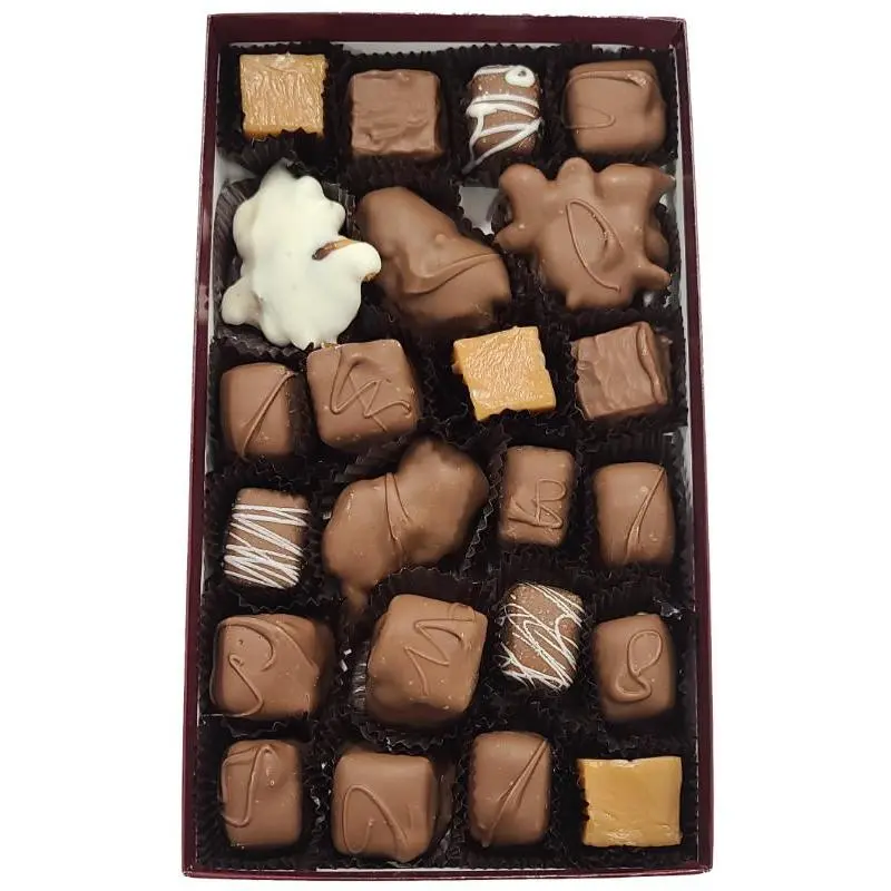 | Ingredients | THIS BOX IS USED FOR MULTIPLE ASSORTMENTS. SEE WEBSITE FOR NUTRITIONAL INFORMATION AND SPECIFIC INGREDIENTS FOR YOUR SELECTIONS. YOUR CONFECTIONS MAY CONTAIN PART OR ALL OF THE FOLLOWING INGREDIENTS: SUGAR, CHOCOLATE, CORN SYRUP, CREAM, NUTMEATS (PECANS, ALMONDS, CASHEWS, PEANUTS, BRAZILS, MACADAMIAS), MILK, BUTTER, COCOA BUTTER, COCONUT OIL, CHOCOLATE LIQUOR (SOME PROCESSED WITH ALKALI), WHITE CHOCOLATE (SUGAR, VEGETABLE OIL [PALM KERNEL OIL & HYDROGENATED PALM KERNEL OIL], WHEY POWDER, WHOLE MILK POWDER, ARTIFICIAL COLOR [TITANIUM DIOXIDE], NONFAT DRY MILK, SOY LECITHIN [AN EMULSIFIER], SALT, ARTIFICIAL FLAVOR), BROWN SUGAR, (COCONUT, AND SODIUM METABISULFITE), COCOA, FRUITS (RASPBERRY, LEMON, APRICOT, MARASCHINO CHERRIES [CHERRIES, HIGH FRUCTOSE CORN SYRUP, SUGAR, MALIC ACID, CITRIC ACID, ARTIFICIAL FLAVORS, RED 40, SODIUM BENZOATE, POTASSIUM SORBATE, SULFUR DIOXIDE, COULD CONTAIN CHERRY PITS]), BAKING SODA, SOY LECITHIN, GELATIN, CREAM OF TARTAR, NATURAL AND ARTIFICIAL FLAVORS, NATURAL COLORING, EGGS, GRAHAM CRACKERS, OREO’S, PRETZELS. DECORATIONS MAY CONTAIN ARTIFICIAL COLORS SUCH AS YELLOW 5, YELLOW 5 LAKE, YELLOW 6, YELLOW 6 LAKE, RED 3, RED 40 LAKE, BLUE 1 LAKE, BLUE 2 LAKE, BLUE 1, BLUE 2. ALLERGENS: CONTAINS SOY, MILK, EGGS, WHEAT, PEANUTS, AND TREE NUTS. DUE TO SHARED EQUIPMENT, ALL PIECE’S MAY ALSO CONTAIN TRACES OF EGG, PEANUTS, TREE NUTS, AND WHEAT. |