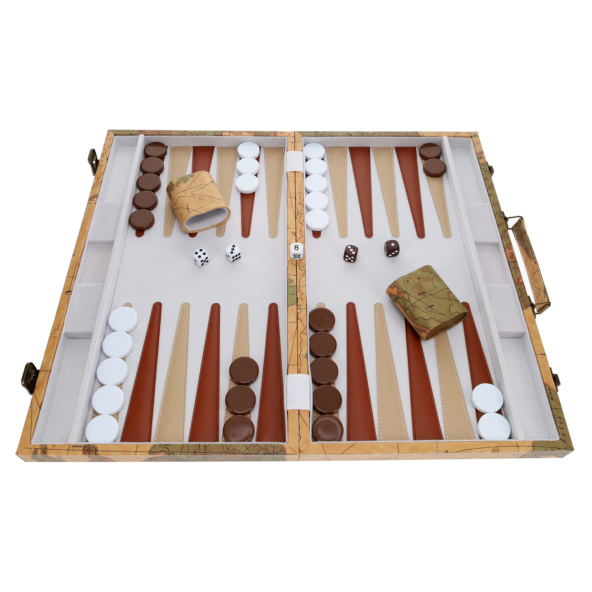 For the adventurer in all of us! This backgammon set is too fun to pass up. Features a beautifully textured, tan, map-motif case with antique brass horse shoe latches, a velvety felt playing surface, and finely stitched leatherette points. This set includes a game instructions booklet, 2 tan leatherette dice cups with world map motif, 30 backgammon pieces, and 4 dice in brown and cream, 1 doubling cube.