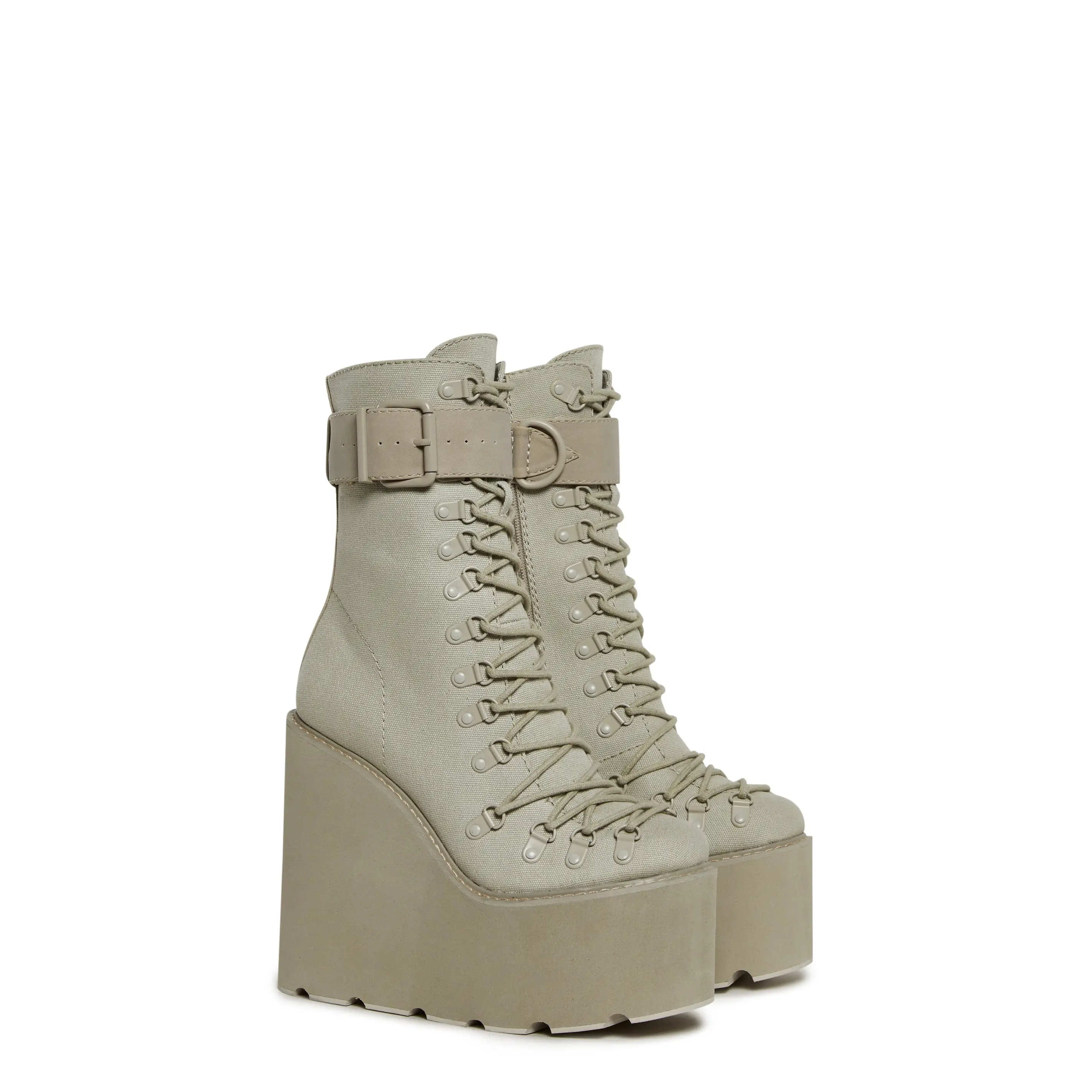 These gnarly platform boots feature a sleek canvas construction, ultra high wedge heels and platforms with cutout treads, laces that run all the way down to the toe, wrapped calf straps with adjustable buckles, and side zip closures.