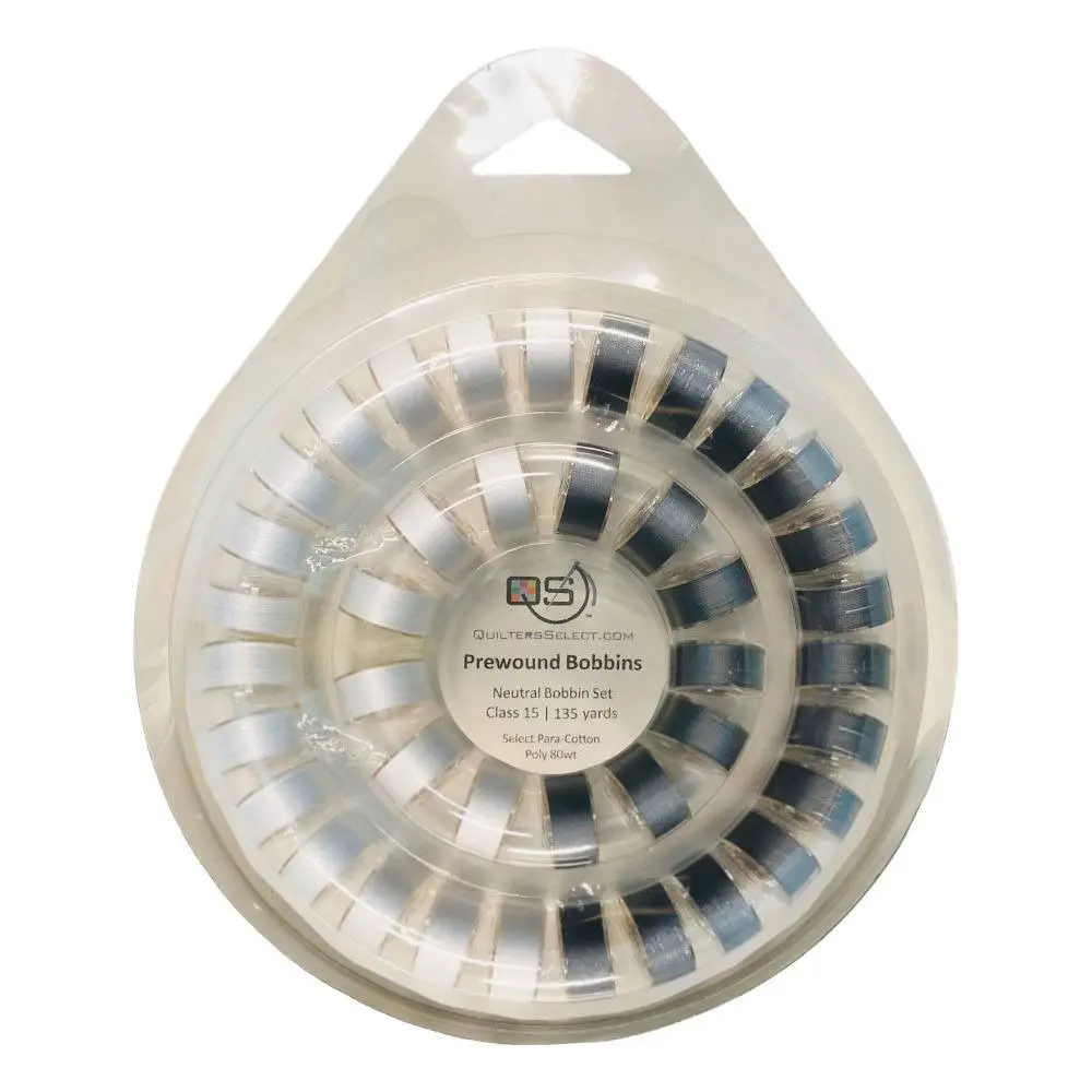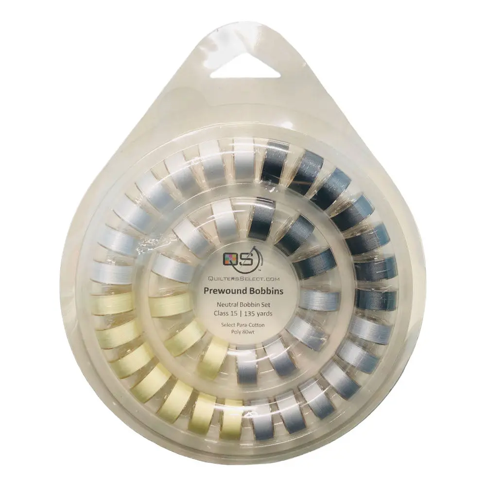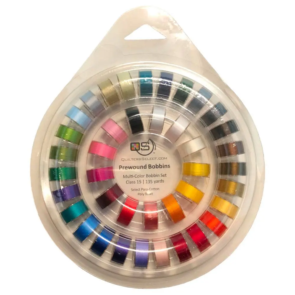 Breathe life into all of your sewing projects with Quilters Select Prewound Bobbin Sets. This package of 40 class 15, prewound bobbins comes in a convenient plastic bobbin ring! The Quilters Select Prewound Bobbin Sets contain Para Polycotton Thread; a versatile, 80wt thread perfect for sewing, quilting, and crafting. Quilters Select Para-Cotton Thread is a poly-cotton blend that has been thermally treated; removing stretch, shrinkage, and weakness. This strong thread has a high sheen that gives every project a professional finish. Para-Cotton 440 yard spools are available to match each bobbin thread. Each Class 15 bobbin contains 135 yards of thread.