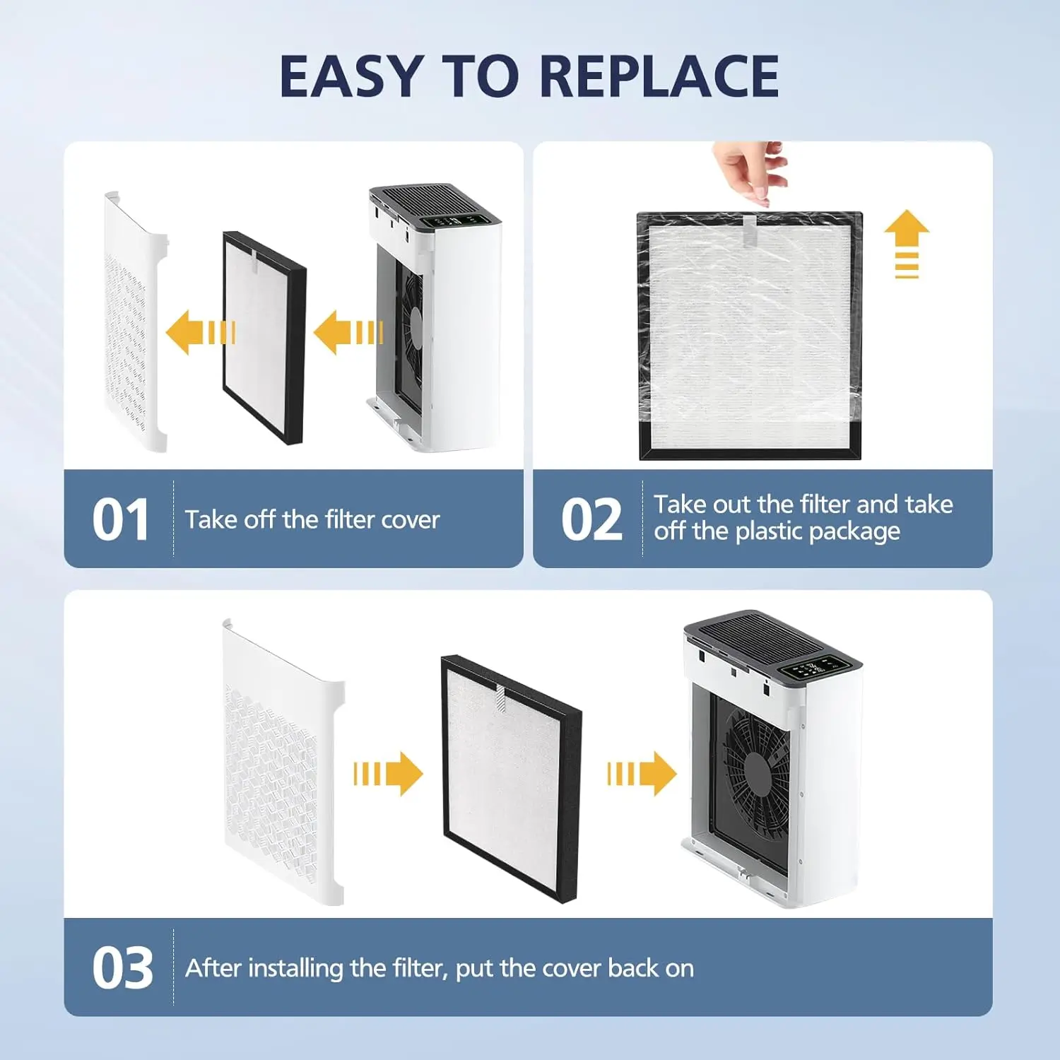 Simple, tool-free setup—just remove and replace. Recommended replacement every 3–6 months depending on usage.