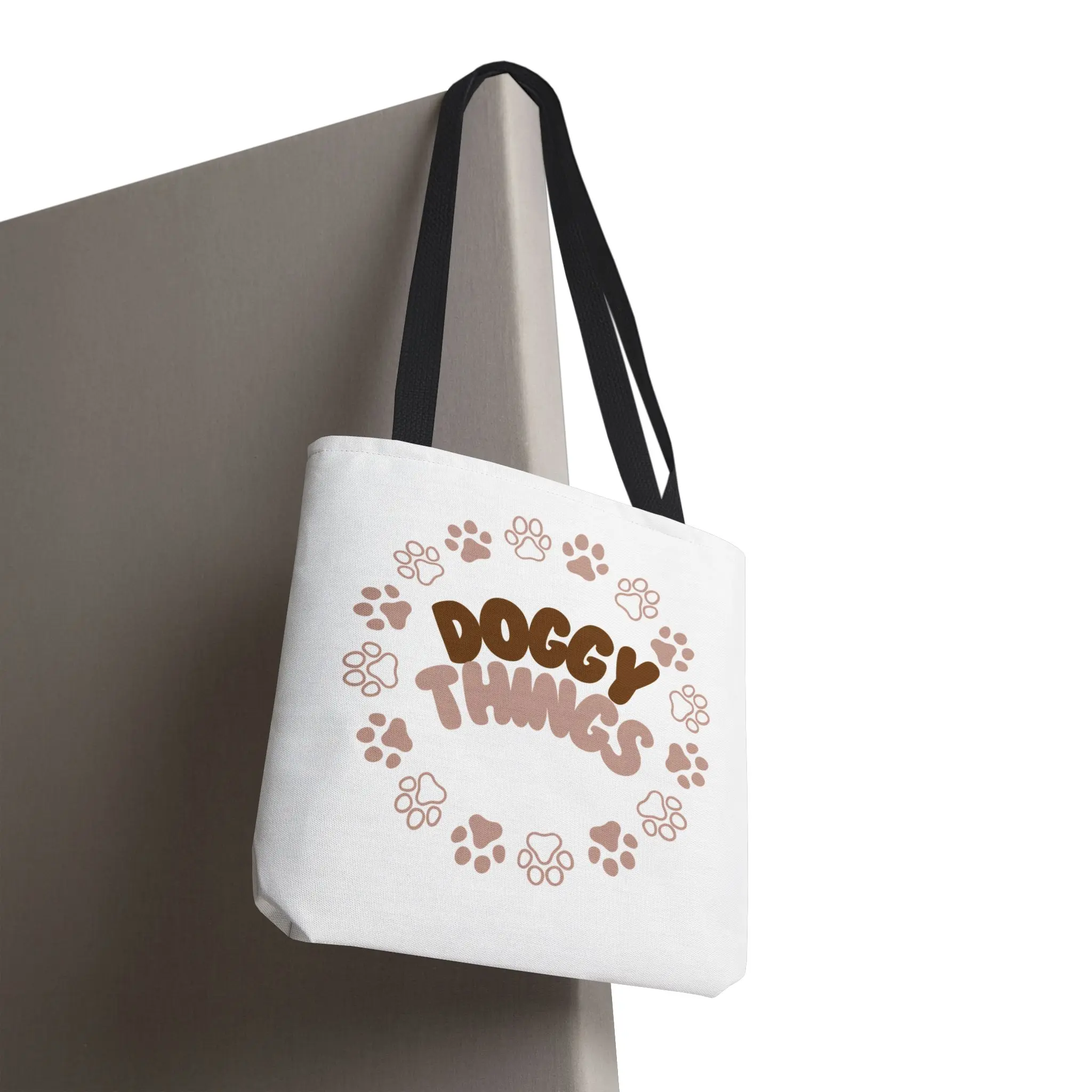 Light, durable, and a little bit playful — this tote carries the small everyday joys of dog life. Soft tan and chocolate lettering reads “Doggy Things” inside a ring of paw prints, so the bag becomes a quick signal to fellow dog people when you’re out walking the neighborhood, popping into the pet store, or heading to a training session. The medium-weight polyester holds shape and dries fast after muddy runs, while boxed corners give extra room for treats, toys, and a folded blanket. Choose a handle color that matches your style and enjoy reinforced stitching that keeps up with heavy use. It looks simple, but it’s built to go everywhere your pup goes.