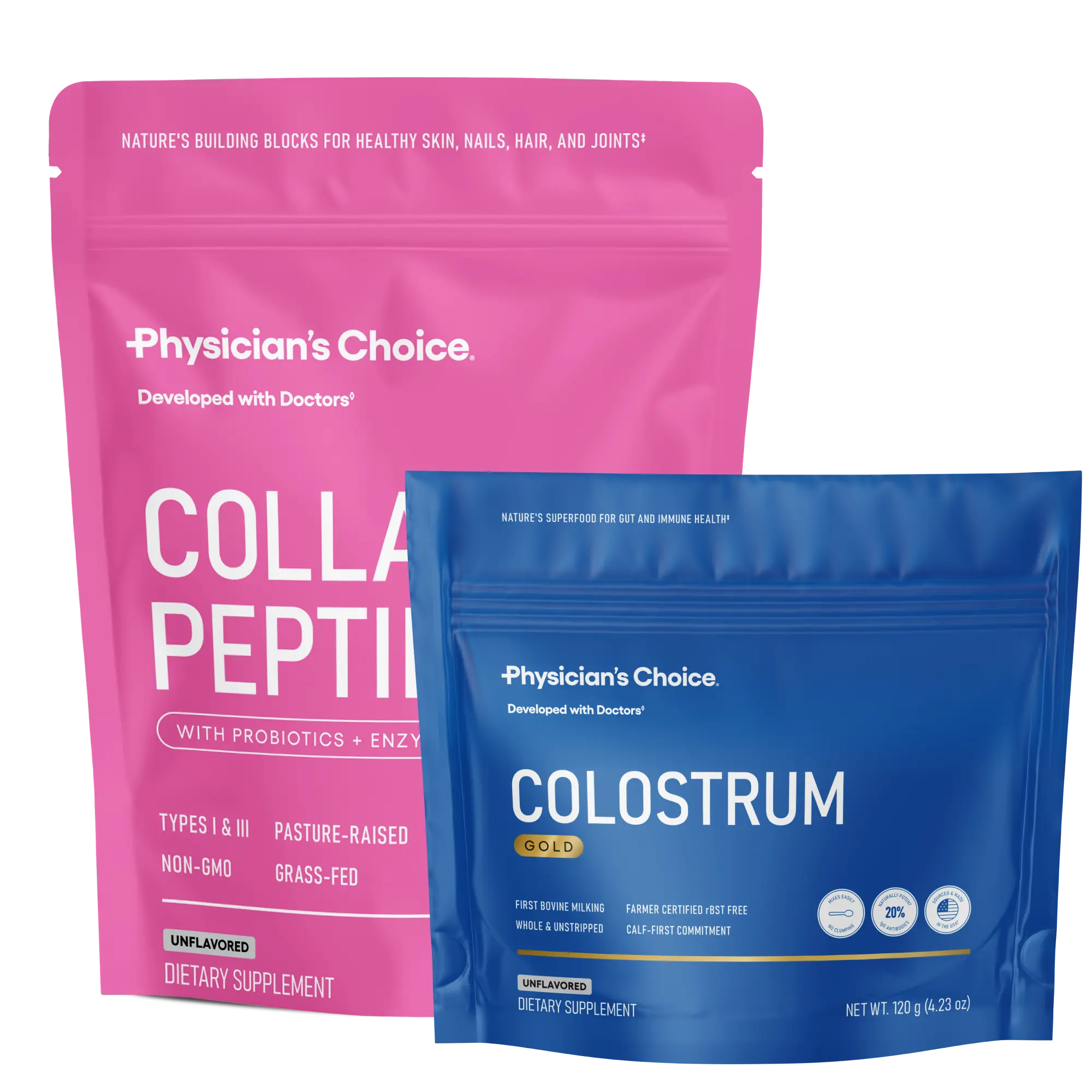 Physician's Choice Gut Glow Up Bundle combines Collagen Peptides Powder and Colostrum Gold - your daily duo for glowing from the inside out with gut health, immunity, hair, skin & nails.