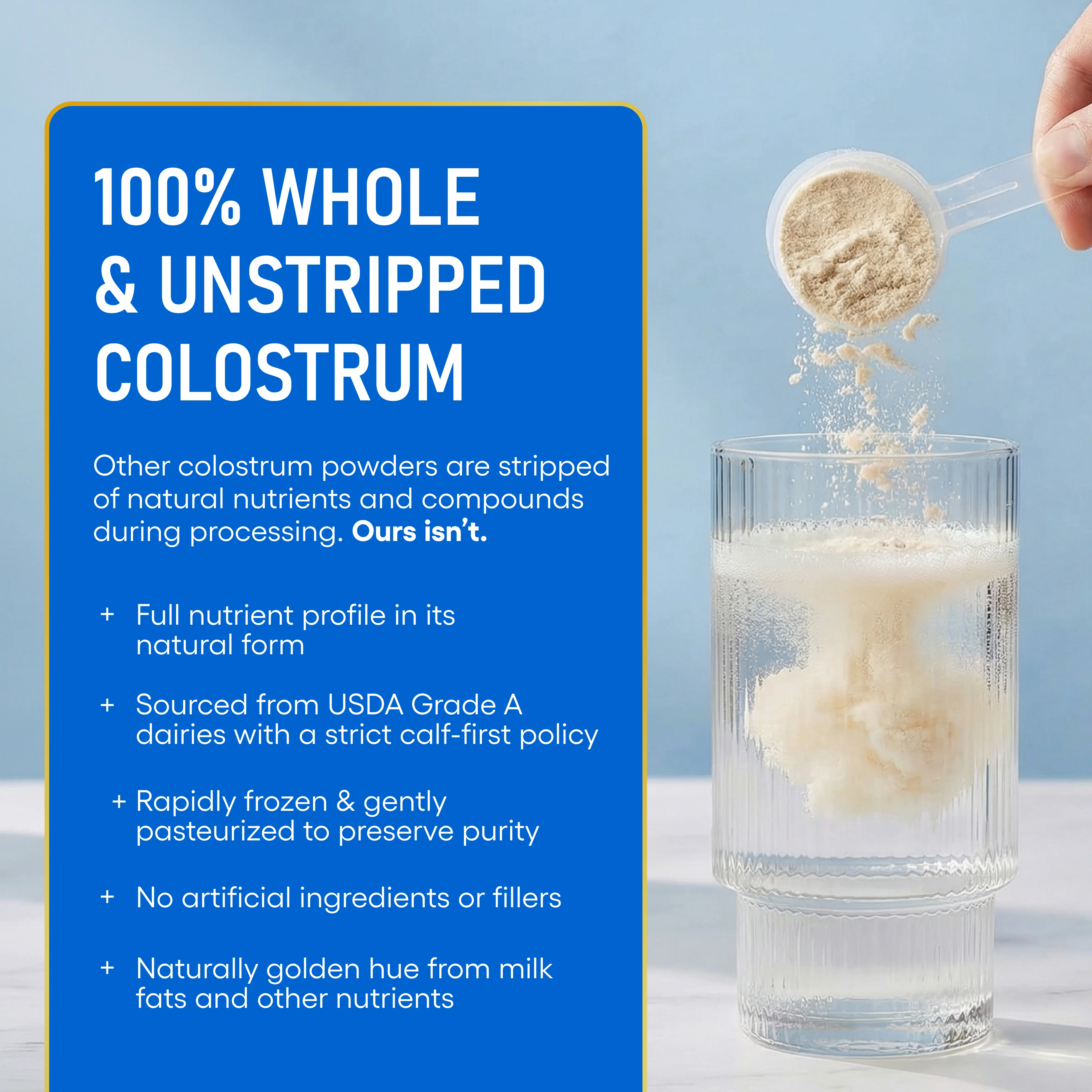 ·Whole & unstripped with nothing removed, nothing added. Ethically sourced from USDA Grade A dairy farms with a calf-first policy. Mix 1 scoop into any cold drink or food daily.