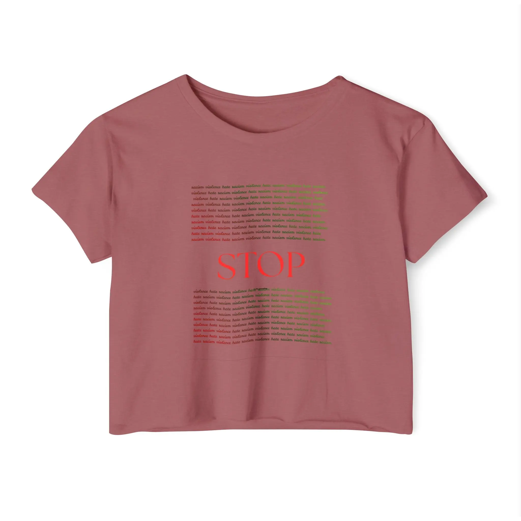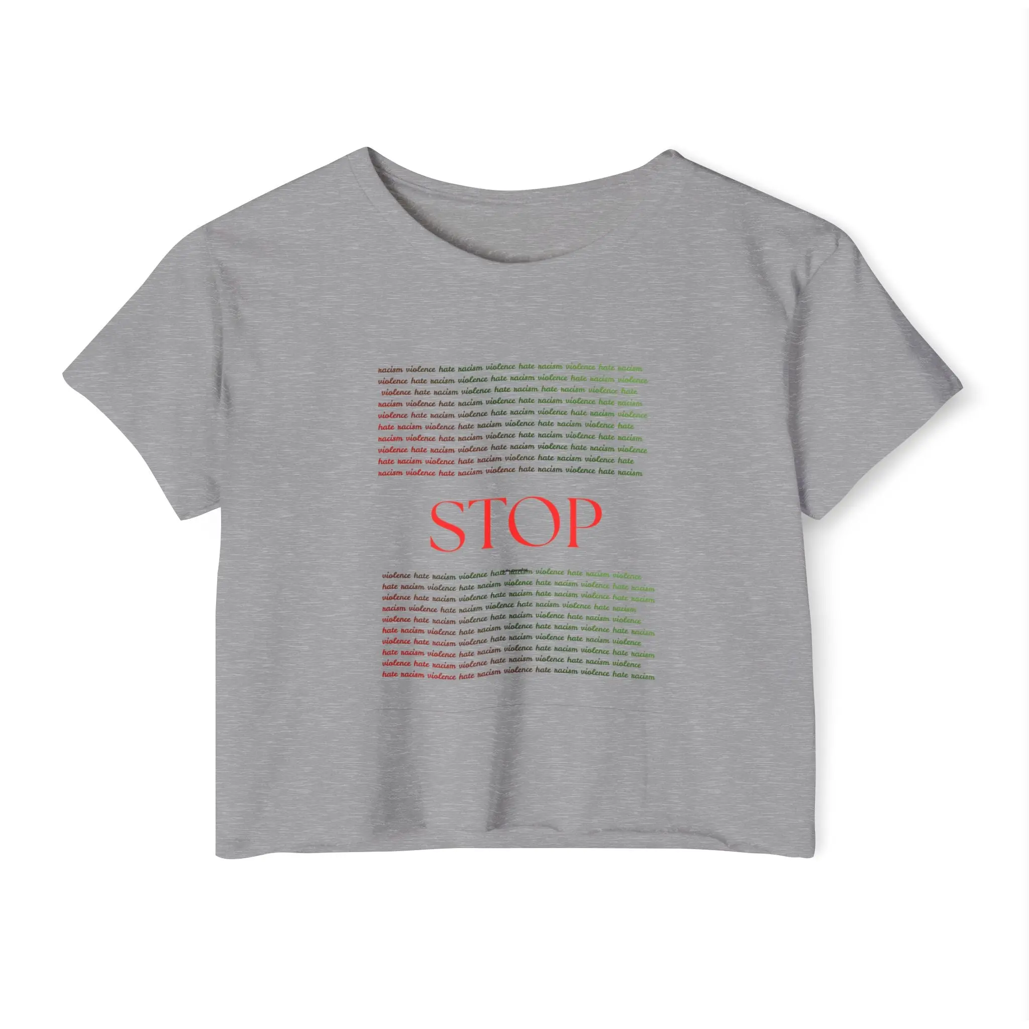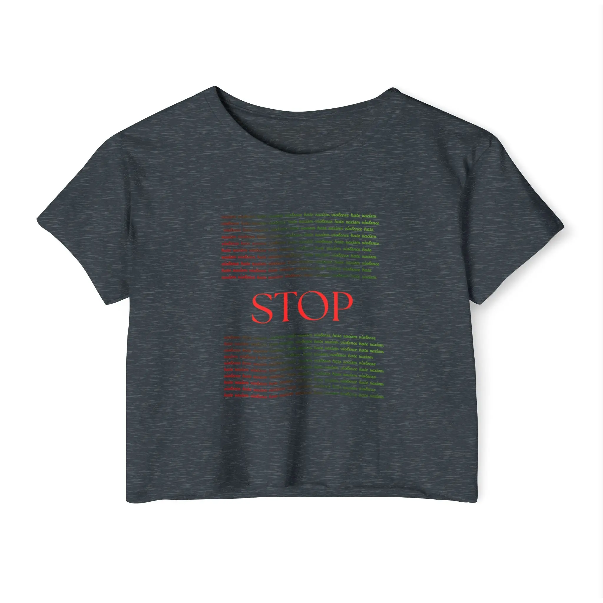 A breezy, light crop top that speaks softly but clearly. The white scoop neckline and relaxed silhouette let the bold red "STOP" and whispering text block take center stage — a wearable statement made gentle by soft, extra-light fabric. The raw sleeve and bottom hems give it an easy, lived-in vibe that layers well for festivals, protests, and long summer days. It feels breathable against sun-warmed skin, holds its shape thanks to shoulder tape, and comes with a tear-away label so nothing interrupts the message or the moment.