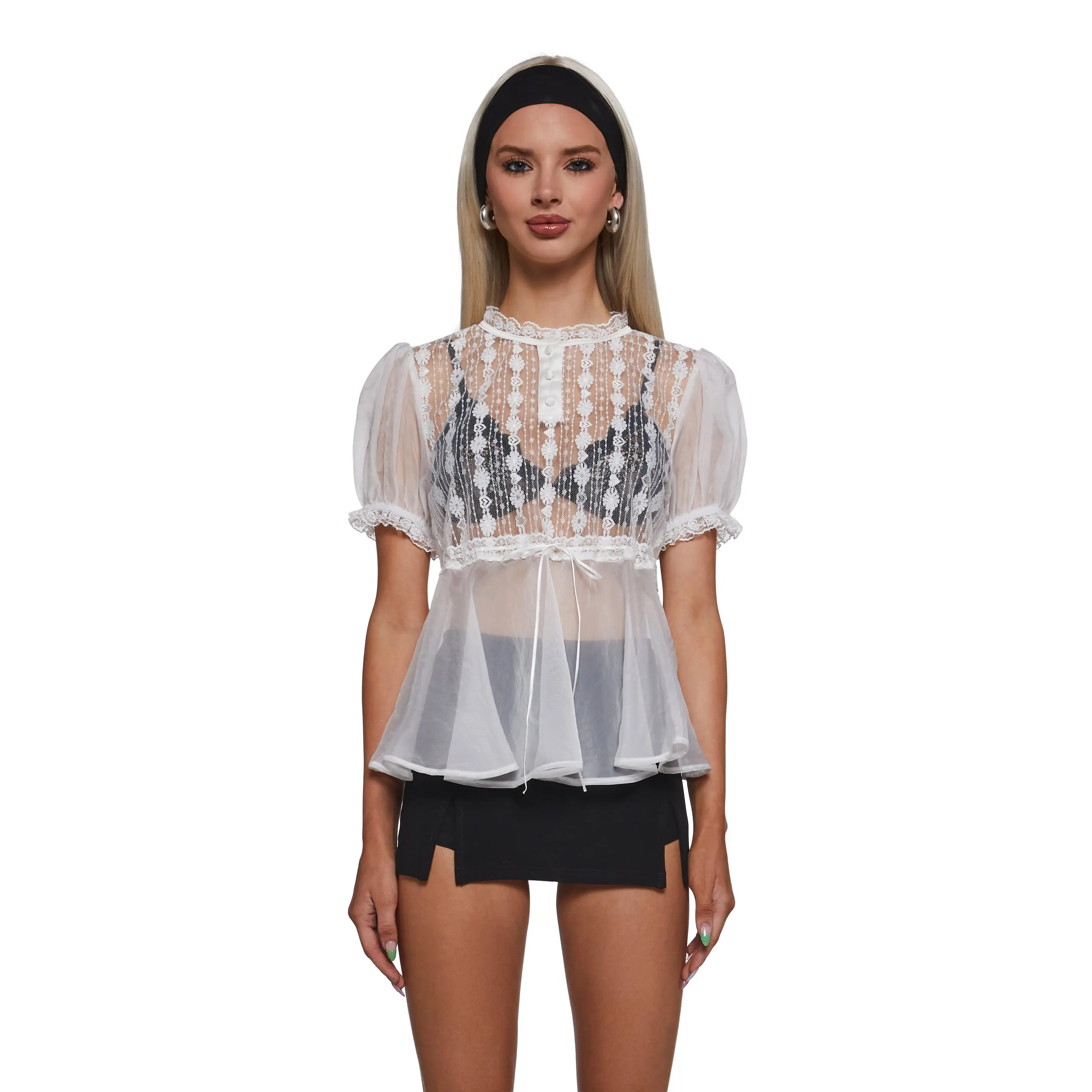 This sheer white blouse is designed with a flattering baby doll silhouette, lace mock neck collar, and dainty lace details, it’s the ultimate layering piece for festival season, date nights, or elevating your daily aesthetic.
