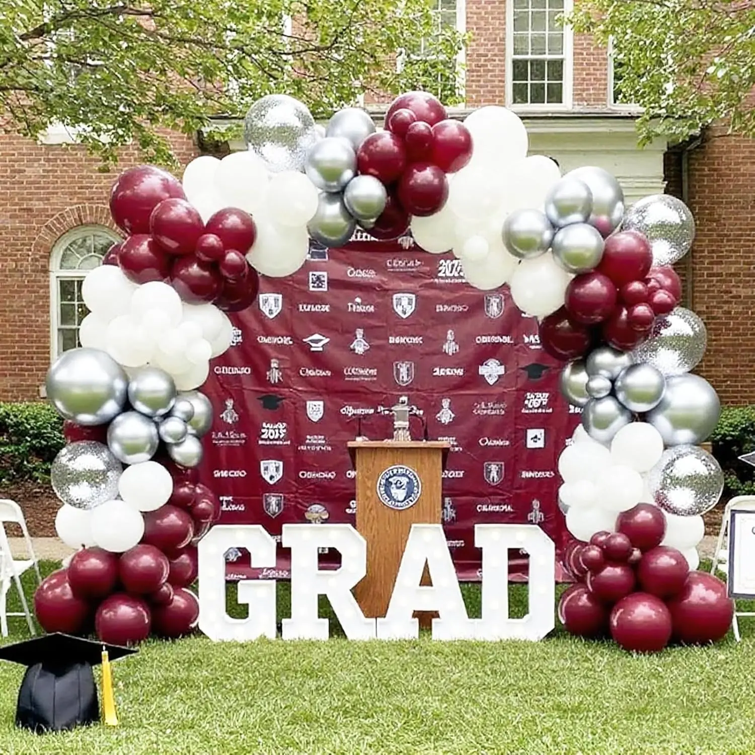 Celebrate graduation in style with this 134-piece maroon, burgundy, and white balloon arch kit, perfect for the class of 2026.