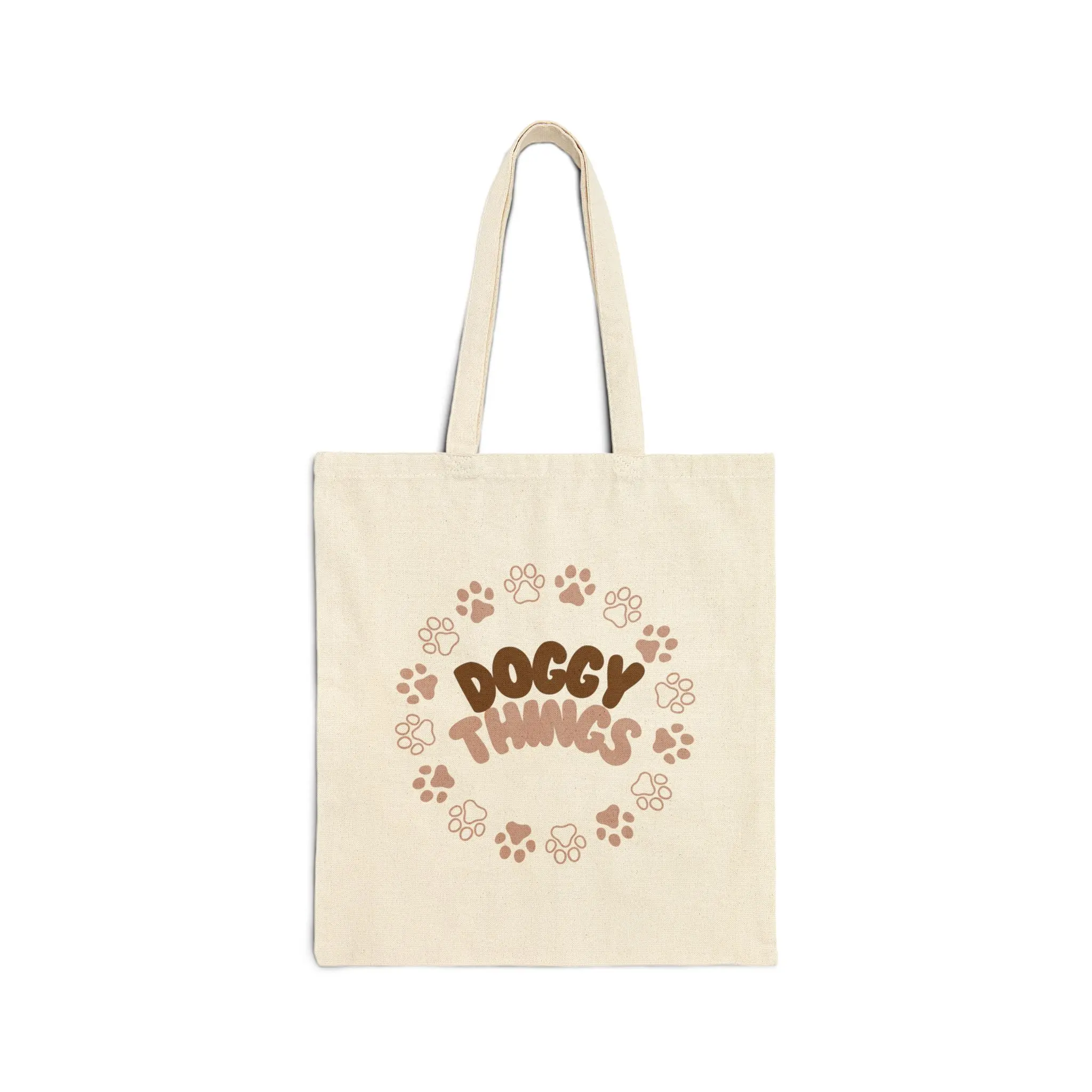 Light, practical, and warm-hearted — this cotton canvas tote carries a soft circle of pawprints and friendly hand-lettering that reads “Doggy Things.” It feels like a quick hello from the park: an everyday companion for leash, treats, and the small essentials you grab on the way out the door. The heavy 12 oz cotton canvas holds its shape and won’t sag when loaded with toys or groceries. Natural tones and simple stitching let the design quietly stand out while staying easy to care for and fold into a bag or basket when not in use.