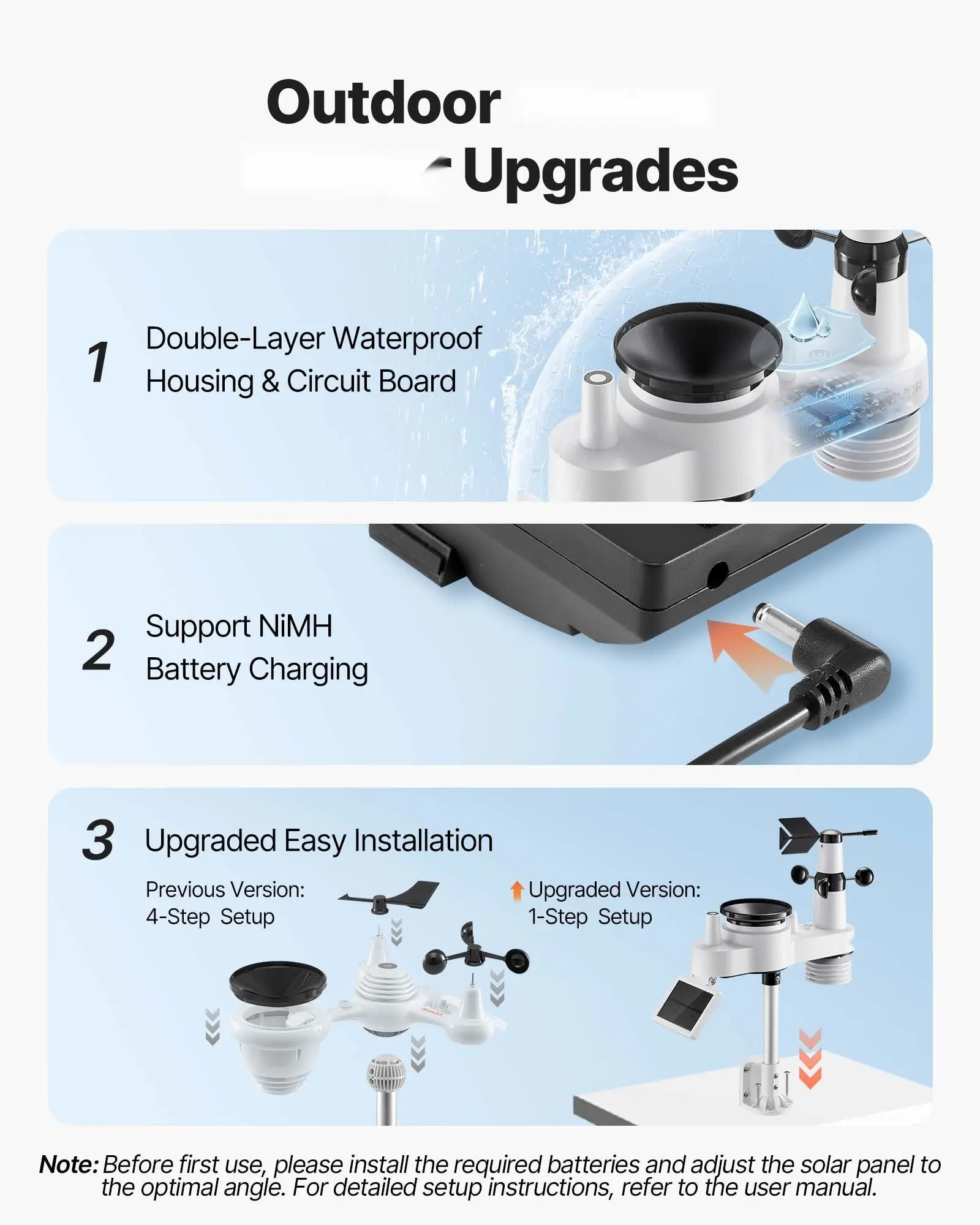 ·Solar Powered, Built to Last: High-efficiency solar panels absorb solar energy during the day and charge the battery at night, cutting energy costs. Our digital weather station comes with an aluminum alloy rod fixed bracket and a charging box